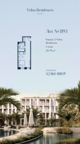Продаётся 1-комнатная квартира в строящемся доме (Дом 2), срок сдачи: II-кв. 2028, общей площадью 45.66 кв.м., на 3 этаже. Volna Residence - это комплекс для жизни на территории комплекса Volna, объединённый с отелем общей концепцией и инфраструктурой. 3 малоэтажных корпуса на 520 номеров расположены на первой береговой линии и имеют собственный бассейн. Территория комплекса Volna - 7,2 га. Более половины этой территории занимает парк и инфраструктура для жизни и отдыха.