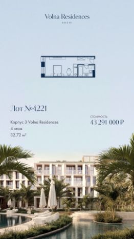 Продаётся 1-комнатная квартира в строящемся доме (Дом 3), срок сдачи: II-кв. 2028, общей площадью 32.72 кв.м., на 4 этаже. Volna Residence - это комплекс для жизни на территории комплекса Volna, объединённый с отелем общей концепцией и инфраструктурой. 3 малоэтажных корпуса на 520 номеров расположены на первой береговой линии и имеют собственный бассейн. Территория комплекса Volna - 7,2 га. Более половины этой территории занимает парк и инфраструктура для жизни и отдыха.
