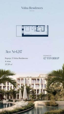 Продаётся 1-комнатная квартира в строящемся доме (Дом 3), срок сдачи: II-кв. 2028, общей площадью 37.29 кв.м., на 4 этаже. Volna Residence - это комплекс для жизни на территории комплекса Volna, объединённый с отелем общей концепцией и инфраструктурой. 3 малоэтажных корпуса на 520 номеров расположены на первой береговой линии и имеют собственный бассейн. Территория комплекса Volna - 7,2 га. Более половины этой территории занимает парк и инфраструктура для жизни и отдыха.