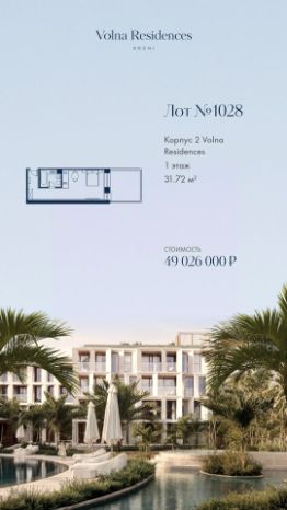 Продаётся 1-комнатная квартира в строящемся доме (Дом 2), срок сдачи: II-кв. 2028, общей площадью 45.66 кв.м., на 3 этаже. Volna Residence - это комплекс для жизни на территории комплекса Volna, объединённый с отелем общей концепцией и инфраструктурой. 3 малоэтажных корпуса на 520 номеров расположены на первой береговой линии и имеют собственный бассейн. Территория комплекса Volna - 7,2 га. Более половины этой территории занимает парк и инфраструктура для жизни и отдыха.