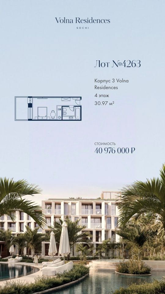 Продаётся 1-комнатная квартира в строящемся доме (Дом 3), срок сдачи: II-кв. 2028, общей площадью 30.97 кв.м., на 4 этаже. Volna Residence - это комплекс для жизни на территории комплекса Volna, объединённый с отелем общей концепцией и инфраструктурой. 3 малоэтажных корпуса на 520 номеров расположены на первой береговой линии и имеют собственный бассейн. Территория комплекса Volna - 7,2 га. Более половины этой территории занимает парк и инфраструктура для жизни и отдыха.