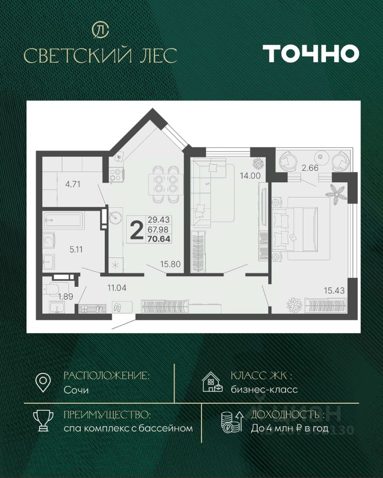 2-комнатные апартаменты располагаются на 2 этаже, а из окон открываются виды на парковую территорию Luciano и на город . Срок сдачи: IV-кв. 2025 Flavium—Luciano — воплощение изысканной архитектуры и гармонии с природой Дом Flavium—Luciano создан для тех, кто ценит утонченную красоту и безупречное качество. Его фасады словно переносят вас в эпоху древнего Рима, где величие соединено с элегантностью. Плавные линии и текстурированные материалы подчеркивают архитектурное мастерство, а панорамные окна раскрывают виды, достойные живописных полотен. Каждая деталь дома продумана до мелочей. Базовая отделка white box позволяет вам воплотить свою мечту об идеальном интерьере. Для тех, кто предпочитает не думать о мелочах, опционально доступна и чистовая отделка. Просторные лоты от 82 до 146 м² дают возможность обрести уютное пространство для жизни. И нет никаких студий только комфортные апартаменты для ценителей высокого уровня жизни. Для вашего удобства предусмотрен вместительный подземный паркинг, оснащённый мойкой, инновационные инженерные системы дома обеспечивают идеальный микроклимат в любое время года, а качественная звукоизоляция позволит наслаждаться морем, местом, природой, не отвлекаясь на постороннее. Жизнь во Flavium—Luciano это не просто пребывание в очередном комплексе. Это среда, формирующая свой комфортный мир вне суеты. Luciano — мир комфорта, который начинается за порогом Инфраструктура Luciano — это воплощение вашей мечты о современном ритме жизни, где все нужное находится в шаговой доступности. Парковая зона и пляж: Представьте утреннюю прогулку среди тенистых деревьев или вечерний отдых у моря. Собственный пляж в 57 минутах ходьбы станет местом, куда захочется возвращаться снова и снова. Гастрономическое путешествие: Четыре ресторана, каждый из которых предлагает уникальный опыт: •''Галерея'' с изысканными блюдами европейской кухни. •''Adriana'', где средиземноморские шедевры встречаются с паназиатскими акцентами. •''Garden Cafe'' с уютной атмосферой сада. •''Посейдон'' — панорамный ресторан на побережье, который станет вашим любимым местом для романтических вечеров. Акватермальный и спа-комплекс: Погрузитесь в мир релаксации с хаммамом, русской баней и приватными спа-зонами. А современный фитнес-клуб и медицинский центр помогут вам заботиться о здоровье и поддерживать отличную форму. Семейный комфорт: Детский клуб Luciano Kids создан для гармоничного развития вашего ребенка. Это место, где малыши познают мир через творчество, а родители могут расслабиться, зная, что их дети в надежных руках. Luciano — это не просто инфраструктура, это образ жизни, который подчёркивает статус и окружает заботой. Flavium—Luciano ждет вас, чтобы стать вашим домом, вашим миром и вашей историей.