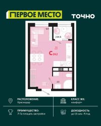 Продается квартира-студия в Жилом комплексе ''Родные просторы''!В квартире выполнена качественная предчистовая отделка: Выровненные и подготовленные для отделки финишными материалами стены — улучшенная штукатурка стен. Подготовленный к укладке покрытия пол — стяжка пола. Коммуникации, выведенные в специальных местах в санузлах и кухонной зоне. Металлические входные двери с внутренней фрезеровкой и 2 замками. Металлопластиковые окна с долговечной фурнитурой. Радиаторы со встроенными терморегуляторами. Гидроизоляция пола санузлов.Крутая комплексная застройка территории с развитой инфраструктурой - на территории комплекса расположены школа на 1550 мест, 3 детских сада на 800 мест, поликлиника и частные клиники. На первых этажах домов расположены коммерческие помещения. Дворы свободны от автомобилей. Для автовладельцев предусмотрено более 2000 мест на открытых парковках по периметру микрорайона, и многоуровневые крытые наземные паркинги. Большая часть микрорайона оборудована пешеходными зонами и благоустроенными придомовыми территориями со спортивными площадками и большими детскими игровыми пространствами. Вся инфраструктура района находится в пешей доступности и располагаться внутри микрорайона.Рядом трасса М-4 - удобный выезд в сторону моря!Звоните прямо сейчас и покупайте квартиру в классном жилом комплексе!