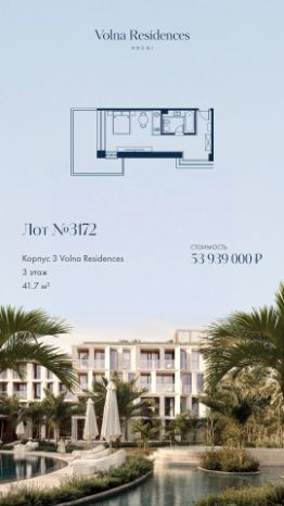 Продаётся 1-комнатная квартира в строящемся доме (Дом 2), срок сдачи: II-кв. 2028, общей площадью 41.7 кв.м., на 3 этаже. Volna Residence - это комплекс для жизни на территории комплекса Volna, объединённый с отелем общей концепцией и инфраструктурой. 3 малоэтажных корпуса на 520 номеров расположены на первой береговой линии и имеют собственный бассейн. Территория комплекса Volna - 7,2 га. Более половины этой территории занимает парк и инфраструктура для жизни и отдыха.