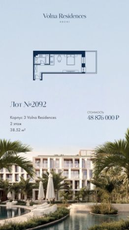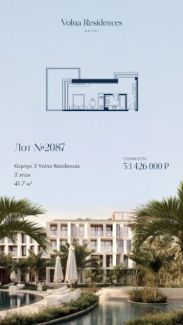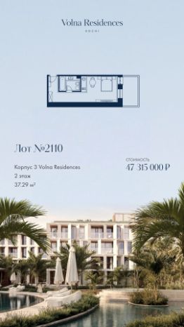 Продаётся 1-комнатная квартира в строящемся доме (Дом 2), срок сдачи: II-кв. 2028, общей площадью 69.77 кв.м., на 2 этаже. Volna Residence - это комплекс для жизни на территории комплекса Volna, объединённый с отелем общей концепцией и инфраструктурой. 3 малоэтажных корпуса на 520 номеров расположены на первой береговой линии и имеют собственный бассейн. Территория комплекса Volna - 7,2 га. Более половины этой территории занимает парк и инфраструктура для жизни и отдыха.