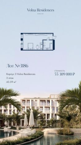 Продаётся 1-комнатная квартира в строящемся доме (Дом 3), срок сдачи: II-кв. 2028, общей площадью 54.32 кв.м., на 4 этаже. Volna Residence - это комплекс для жизни на территории комплекса Volna, объединённый с отелем общей концепцией и инфраструктурой. 3 малоэтажных корпуса на 520 номеров расположены на первой береговой линии и имеют собственный бассейн. Территория комплекса Volna - 7,2 га. Более половины этой территории занимает парк и инфраструктура для жизни и отдыха.