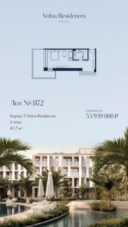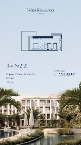 Продаётся 1-комнатная квартира в строящемся доме (Дом 3), срок сдачи: II-кв. 2028, общей площадью 36.13 кв.м., на 3 этаже. Volna Residence - это комплекс для жизни на территории комплекса Volna, объединённый с отелем общей концепцией и инфраструктурой. 3 малоэтажных корпуса на 520 номеров расположены на первой береговой линии и имеют собственный бассейн. Территория комплекса Volna - 7,2 га. Более половины этой территории занимает парк и инфраструктура для жизни и отдыха.
