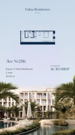 Продаётся 1-комнатная квартира в строящемся доме (Дом 2), срок сдачи: II-кв. 2028, общей площадью 32.72 кв.м., на 3 этаже. Volna Residence - это комплекс для жизни на территории комплекса Volna, объединённый с отелем общей концепцией и инфраструктурой. 3 малоэтажных корпуса на 520 номеров расположены на первой береговой линии и имеют собственный бассейн. Территория комплекса Volna - 7,2 га. Более половины этой территории занимает парк и инфраструктура для жизни и отдыха.