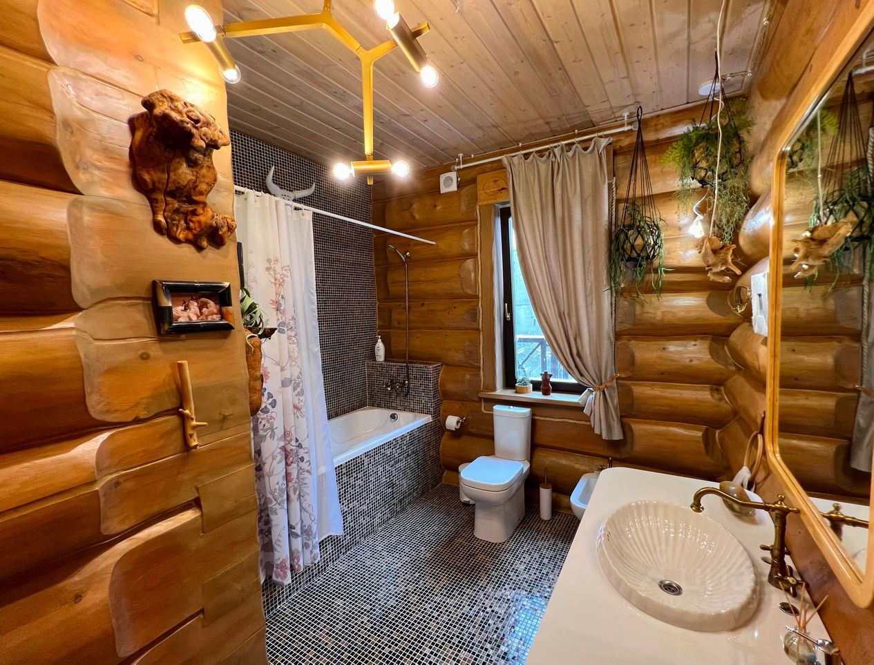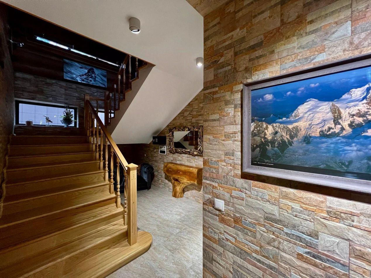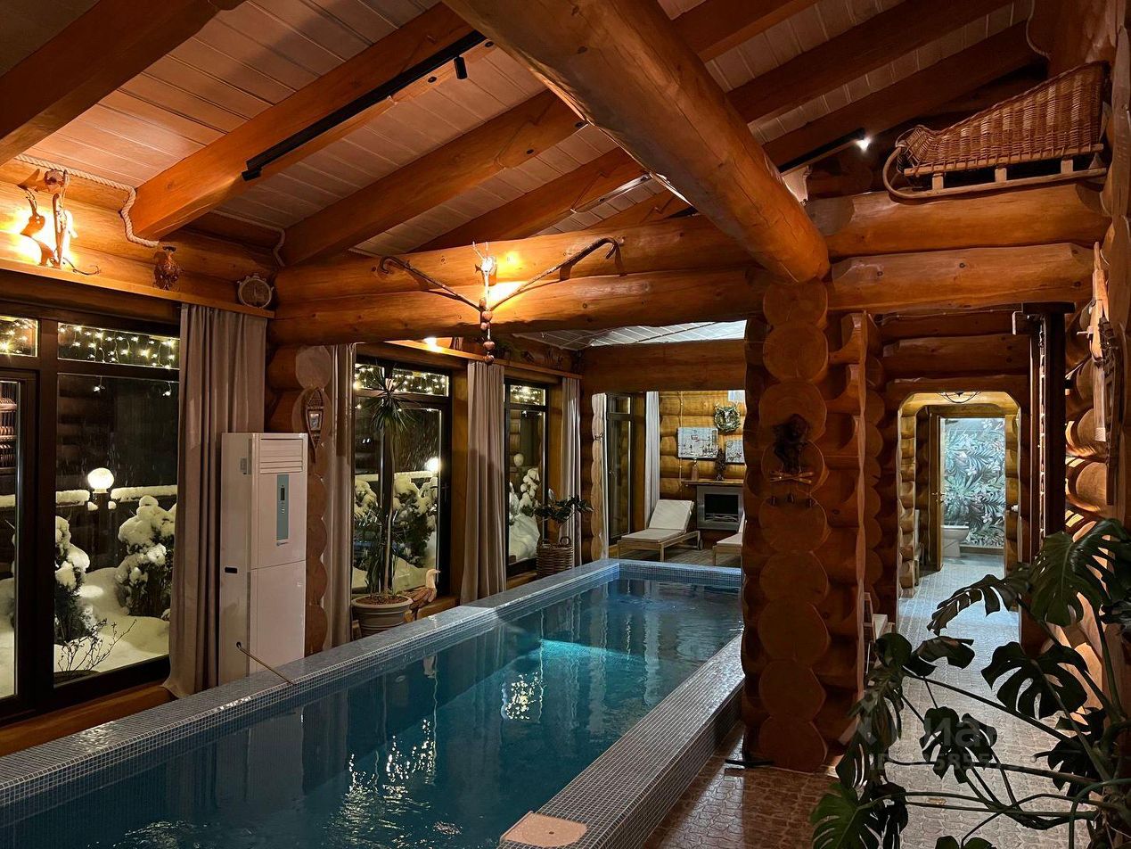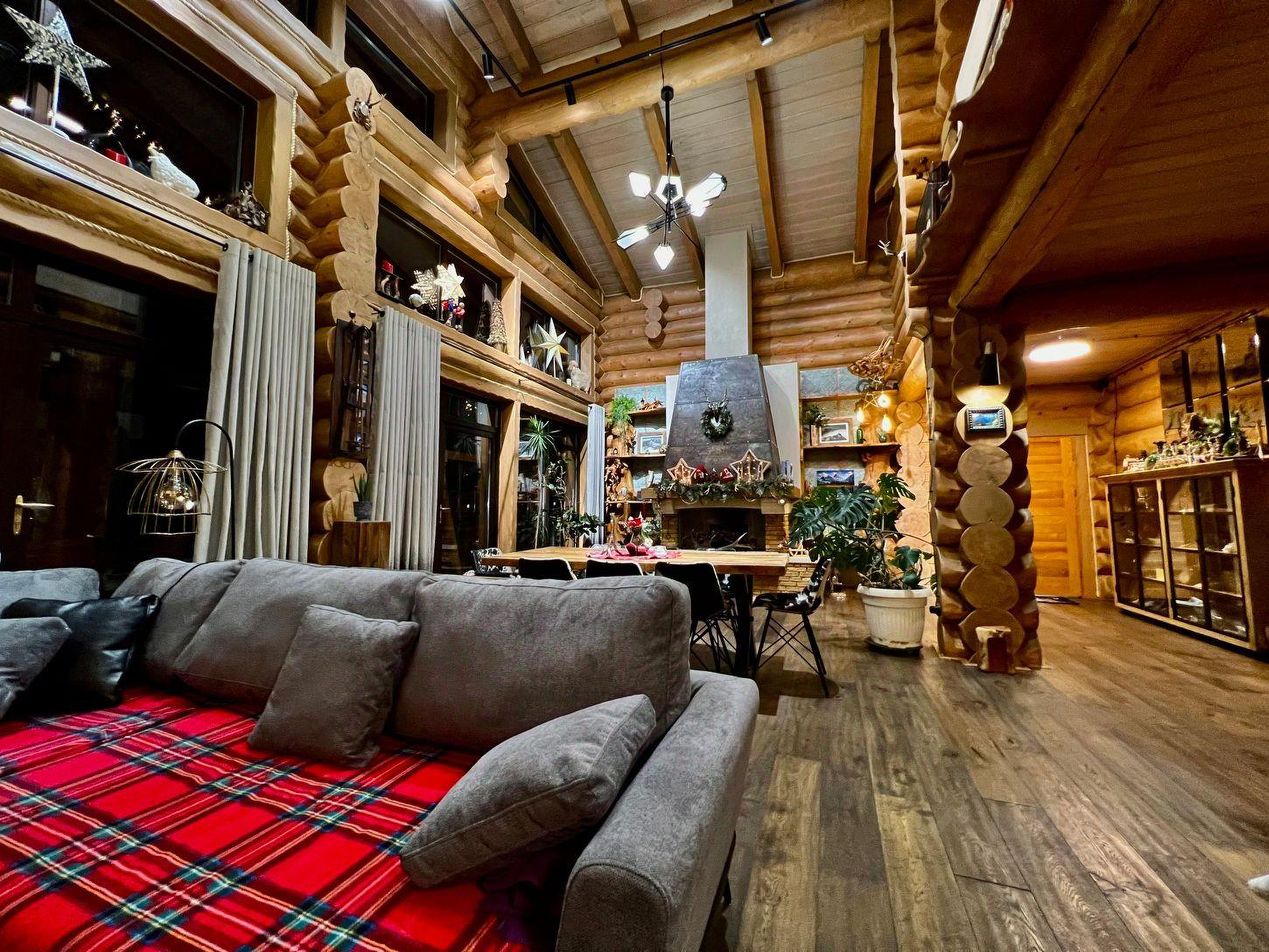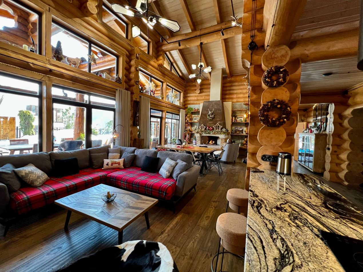 Горный дом дизайнерское трехэтажное шале из векового кедра в горах Красной Поляны, расположенное на высоте 780 м над уровнем моря. На цокольном этаже расположены: большой просторный гараж с хранилищем для лыж, прихожая, гостевая спальня, санузел с прачечной и основная оборудованная кухня. По широкой лестнице вы попадаете в гостиную со вторым светом, демонстрирующую стильное сочетание тематического декора привезённого с разных горных уголков мира. Гостиная включает в себя обеденную зону на 8 гостей, зону отдыха с мягким угловым диваном и большим тв, мини-кухню с барной стойкой и огромный дровяной камин. Днем гостиная пронизывается солнечными лучами, а вечером наполняется чувственным освещением с многообразием вариантов подсветки и мерцанием пламени камина, что делает атмосферу невероятно теплой и уютной. Панорамное остекление гостиной дарит захватывающий вид на кавказские горы. Выход из гостиной на террасу позволяет гостям расширить пространство и переместиться на свежий воздух к обеденному столу и качелям. Оборудованная на участке под навесом зона барбекю с большой барной стойкой дает возможность приготовить любимые блюда на мангале и приятно провести время за любимым напитком. Самый быстрый способ отвлечься от суеты повседневной жизни и восстановить силы, это пройти из гостиной в зону СПА, где 9-ти метровый бассейн, панорамное остекление с завораживающими видами, финская сауна и душевно подобранный декор позволит вам окунуться в атмосферу блаженства и релакса. Также на этом этаже расположена уютная гостевая спальня и ванная комната. Поднявшись выше по лестнице вы попадаете в уютный холл, объединяющий входы в детскую и основную спальни. Основная спальня имеет свою ванную комнату и балкон с панорамным видом на горы. Современный взгляд на деревенскую альпийскую эстетику отобразился в стенах этого шале, сделав его невероятно уютным и теплым.