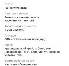 Арт. 105372312 ЗЕМЕЛЬНЫЙ УЧАСТОК.ОБЩАЯ ПЛОЩАДЬ 636 кв.м.КАДАСТРОВЫЙ НОМЕР: 23:49:1000001:551Участок 6 соток расположен в Краснодарском крае, город Сочи, Лазаревский район, посёлок Нижняя Хобза, садоводческое дачное товарищество ''Русь'', участок 260.Нижняя Хобза - курортный микрорайон. Находится в южной части Лазаревского района в низовье одноимённой реки Хобза. Расположен в 40 км к юго-востоку от районного центра-Лазаревское, в 27 км к северо-западу от Центрального Сочи и в 270 км к югу от города Краснодар (по дороге). На западе омывается водами Чёрного моря, на востоке возвышаются лесистые горы.Микрорайон расположен в узкой долине у черноморского побережья. Рельеф местности в основном холмистая, местами обрывистая. Основное население микрорайона проживает у побережья или вдоль речной долины. Средние высоты на территории аула составляют около 28 метров над уровнем моря. Абсолютные высоты достигают 300 метров над уровнем моря.Гидрографическая сеть представлена в основном рекой Хобза. В центре микрорайона в него впадет его главный правый приток Ходжиек.В микрорайоне расположено несколько санаториев, пансионатов и баз отдыха. Развивается гостиничный комплекс. Жилые строения у побережья расположены в основном у места впадения Хобзы в Чёрное море. Далее посёлок узкой полосой вдоль реки Хобзы поднимается выше по ущелью, постепенно расширяясь.Основную роль в экономике микрорайона как и в целом по Сочи, играют туризм и садоводство. К востоку от посёлка расположены несколько крупных садово-некоммерческих товариществ.Свободная продажа.Быстрый выход на сделку.Юридическое сопровождение.ЗВОНИТЕ, готовы дать всю дополнительную информацию и обеспечим просмотр в удобное время.#Куплю_участок, #куплю_земельный_участок, #куплю_участок_в_Сочи, #куплюучасток