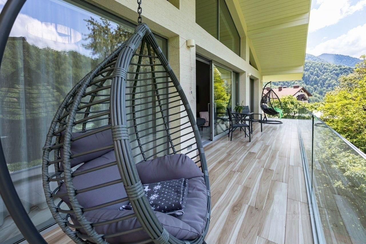 Сдается уникальная дизайнерская 3-х комнатная квартира , которая расположена на 2 этаже дома-шале со своим отдельным входом Сдается как длительно , так и краткосрочно . Стоимость на ваши даты уточняйте индивидуально Дом-шале расположен на высоком берегу реки Бешенка. Из панорамных окон и открытой лоджии-террасы открывается красивый вид на горный хребет и кругозор Ефремова. Под окнами шумит горная речка, поют птицы. В другую сторону вид на хребет Аибга. 3 отдельные спальни, каждая со своим санузлом, с комфортными двуспальными кроватями, готовы принять по 2 гостя (общее количество гостей до 6 человек). Дети до 3-х лет размещаются с родителями, дети страше 3-х лет как взрослые по запросу на доп.места. В каждой спальне оборудованы просторный шкаф и письменный стол. Сердцем квартиры является большая гостиная-столовая с живым камином. Стол из натуральных материалов (мрамор и массив бука) соберет большую семью за вкусной трапезой. В квартире имеется все необходимое для комфортного проживания: • Полностью оборудованная всем необходимым кухня: кофемашина, посудомоечная машина, варочная поверхность 4 конфорки, духовка, тостер, современная посуда и столовые приборы, • Живой камин на дровах, • быстрый интернет Wi-Fi, • Smart TV 65'', • Стиральная машина-автомат, • Фены в каждой ванной комнате, • Есть кедровая сауна Здравница, • Утюг и гладильная доска, • Полотенца и ванные принадлежности, • Постельное белье и ортопедические матрасы, • теплый пол по всей площади квартиры, • приточно-вытяжная вентиляция, •кондиционер •потолочные вентиляторы в каждой спальне. •в зимний сезон работает отдельная комната для горнолыжного оборудования, с профессиональной сушильной установкой для ботинок. Квартира расположена в центре Красной Поляны у остановки Часовня. В 100 метрах находятся 3 продуктовых сетевых магазина, рестораны, кафе и кофейни. 1 место для 1 автомобиля гостей внутри на закрытой парковке. Свободная парковка для автомобилей вдоль улицы. При размещении с животными залог +15т.р рублей+3т.р за уборку.