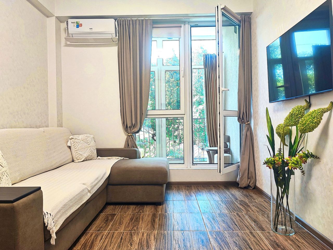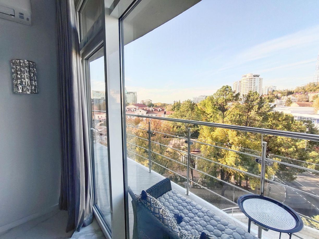 Квартира в Центральном Сочи с лоджией и видом на лес. Новый ремонт и новая мебель. ул.Санаторная, 48. СОБСТВЕННИК! Дом расположен рядом с лесопарковой зоной. Прямо у дома остановка общественного транспорта (6 и 23 автобусы). Поблизости супермаркет Магнит, аптеки, магазин на территории ЖК, а также кофейня. На придомовой территории - места для парковки авто. В квартире есть: кондиционер, холодильник, варочная поверхность, вытяжка, стиральная машина. Посуда, постельное бельё, полотенца. Интернет, WiFi, ТВ. Два раскладных дивана. Тёплый пол. Москитная сетка на выходе на лоджию. Кресла на лоджии и барные стулья. Квартира с отдельным входом (не через подъезд, а через отдельную дверь - на видео можете посмотреть, как это выглядит) При заселении беру гарантийный залог, который возвращаю при выселении. Заселение обычно в любое время после 14:00, выезд до 10:00. Сдаю на срок от 6 месяцев (на короткий срок менее 6 месяцев сдаю не всегда - нужно обсуждать по телефону).