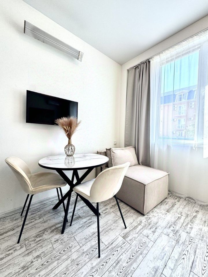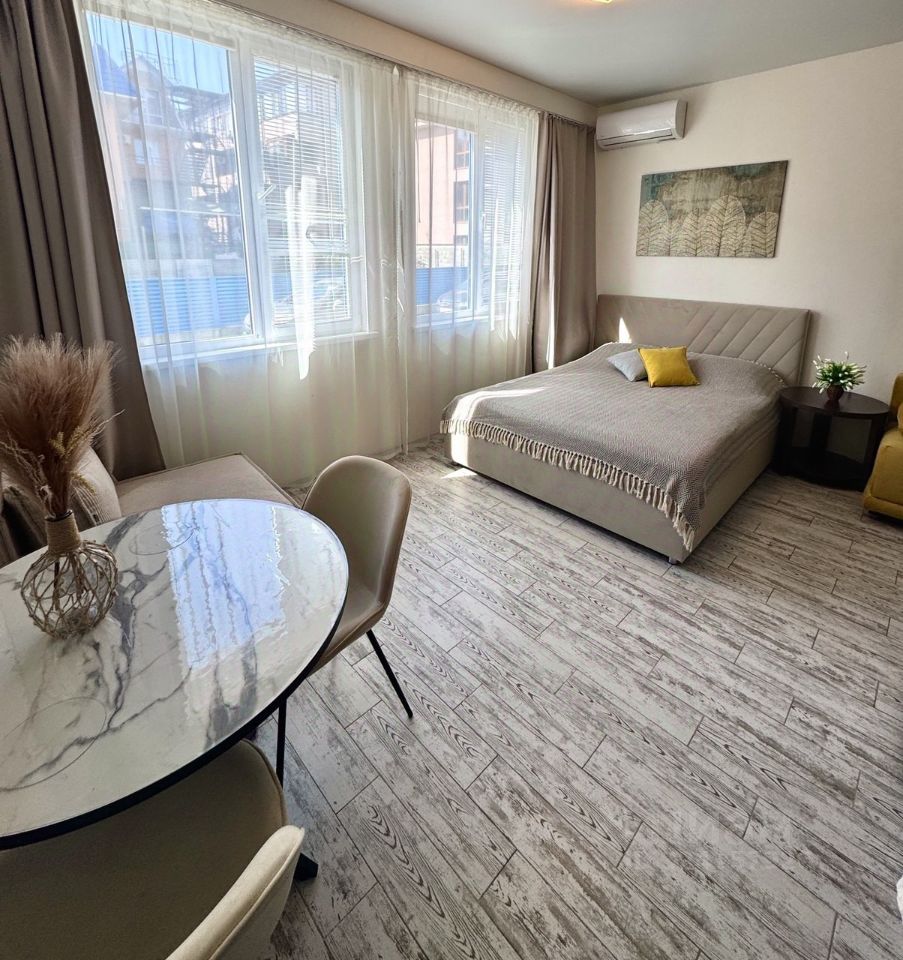 В курортном городке, у самого моря , сдаётся видовая студия, с панорамными окнами в пол, с видом на море, горы и санаторий Знание. Сдаётся до июня. Далее посуточно до октября.