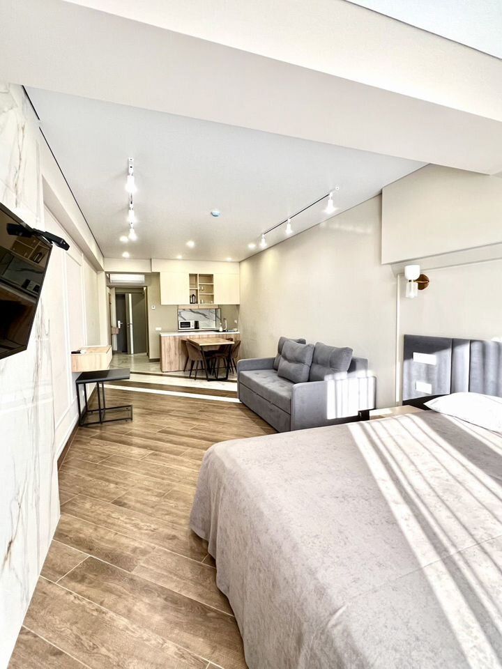 Видовая студия в доме бизнес класса с дизайнерским ремонтом. для комфортного проживания есть всё необходимое. Бытовая техника, интернет,посуда. В квартире два спальных места. Проживание с детьми не возможно! Проживание возможено с 09 января 2026 до 31.05.2026г. Аренда за месяц-40 000? плюс коммунальные услуги по квитанции. Залог-20 000?. Клининг-3000? удерживается с залога. Запрещено: курить и проживать с животными!