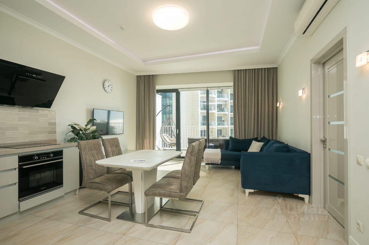 Долгосрочная аренда в элитном комплексе Актер Галакси! Апартамент на высоком этаже с большой террасой, витражными окнами и потрясающим видом на город и море! Планировка с 2 спальнями, объединенной кухней-гостиной, 2 санузлами. Полностью укомплектован мебелью, бытовой техникой, посудой, постельным бельем. Возможна регулярная уборка за дополнительную плату. Установлена центральная климатическая система с регулятором температуры (очень комфортно летом), теплые полы по всей квартире, телевизор с Смарт ТВ. Апартаменты находятся в комплексе с большой инфраструктурой, на территории летом работает бассейн, на постоянной основе работает 2 ресторана, кафе, магазин, салон красоты и многое многое другое! В летние месяцы работает пляж комплекса (оплачивается дополнительно). Парковка на территории дома бесплатная. Условия аренды: - Стоимость: Октябрь - Май: 130 000р в месяц Июнь - Сентябрь: 190 000р в месяц - КУ оплачиваются отдельно Арендатором - Комиссия 50% о стоимости первого месяца единоразово - Проживание с домашними животными запрещено
