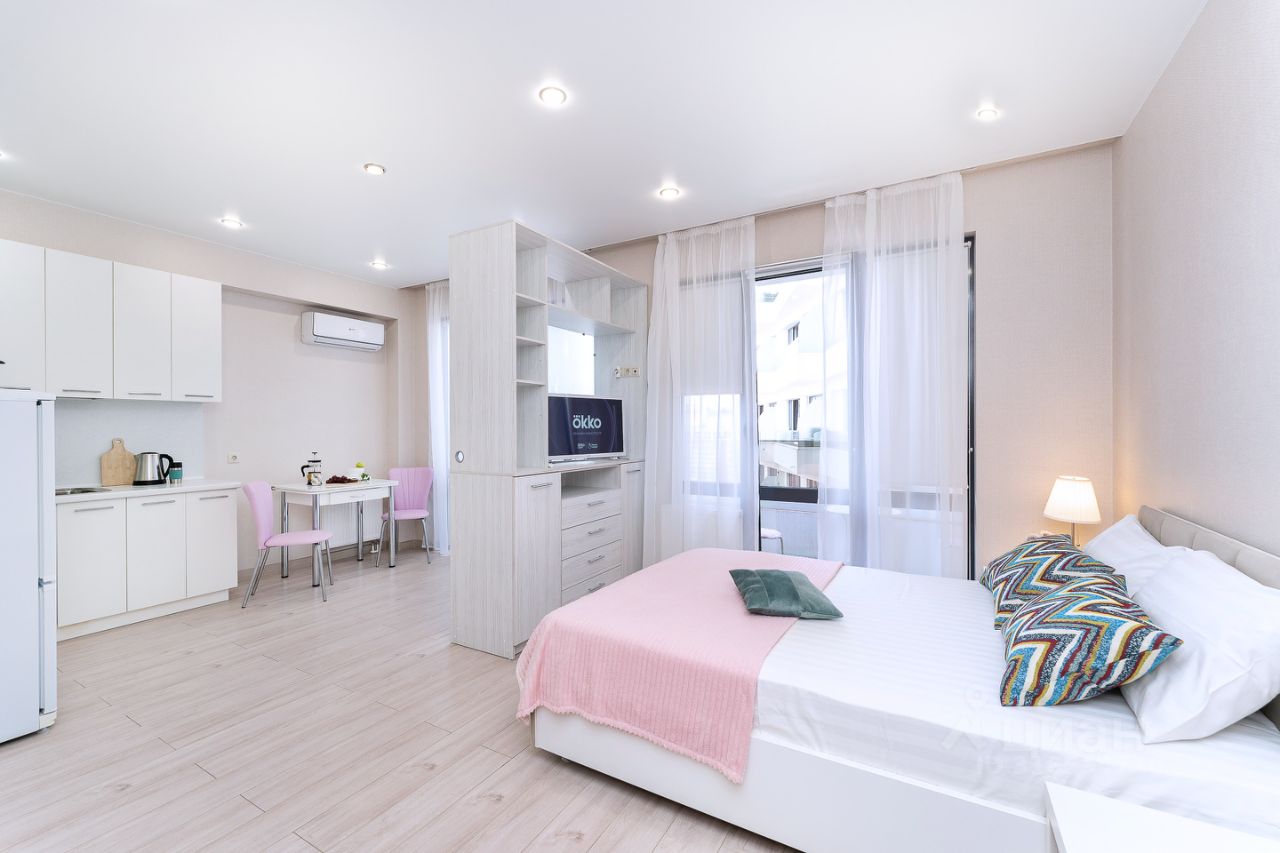 Сдается на длительный срок-до лета (май включительно). При аренде на иной срок, цена устанавливается индивидуально по договорённости. БЕЗ КОМИССИИ! ЖК Крымский удобно расположился на берегу Чёрного моря. Специально для гостей, желающих провести чудесный отдых на лучших пляжах города с лазурной и чистой морской водой. Данная студия предназначена для ценителей прекрасного, пребывание в которой оставит только яркие и положительные впечатления. Квартира детально продумана и укомплектована: 1. Спальная зона для качественного сна, двуспальная кровать, раскладной диван-кресло. 2. Балкон с великолепным видом на горы и окрестности города, столик и стулья. Все это позволит по-настоящему расслабиться, и с наслаждением вкусить чашку любимого кофе, встречая рассвет или, какао, провожая закат. 3. Выделенная обеденная зона. Оборудованная кухня в современном стиле: холодильник, встраиваемая варочная панель, вытяжка, микроволновая печь, чайник, посуда для приготовления, столовая посуда и приборы, кухонные принадлежности. 4. Современная электроника и техника: ЖК-телевизор, быстрый стабильный WIFI, кондиционер, стиральная машина, фен, утюг, гладильная доска, сушилка для белья. 5. Совмещенный сан-узел: душ, туалет, полотенцесушитель, большое зеркало с подсветкой. 6. В стоимость проживания включено: комплект белого постельного белья и полотенец, разовый комплект для личной гигиены (мыло, гель для душа, шампунь), средство для мытья посуды. Жилой комплекс находится на территории современного района Мамайка с развитой инфраструктурой. Рядом расположены столовые, кафе, рестораны, кофейни, сетевые магазины Магнит, Пятерочка, банкоматы, ярмарки местной продукции свежие овощи фрукты по сезону. Вблизи проложена современная красивая набережная вдоль реки Псахе. Где можно провести время для отдыха, свежих прогулок, для занятия спортом с пользой для здоровья (в наличии несколько спортивных площадок, оборудованных для work Out). В непосредственной близости комплекса имеются детские площадки, а также детская комната для развития детей всех возрастов. Район отличается высокой доступностью к основным достопримечательностям города Сочи. Рядом имеется ЖД станция, откуда есть возможность добраться до: - ЖД вокзал Сочи (~7 мин) - Олимпийский парк (~45 мин), - Аэропорт Сочи (~45 мин) - Красная Поляна (~1 час 15 мин). Также можно воспользоваться дублером Курортного проспекта (главная транспортная артерия города Сочи): - ЖД вокзал Сочи (~ 10 мин) - Олимпийский парк (~50 мин), - Аэропорт Сочи (~45 мин) - Красная Поляна (~1 час 25 мин). В пешей доступности для гостей: - море, магазины, кофейни, кафе, столовые, банкоматы, детские и спортивные площадки ~ 300м. - набережная, зоопарк, аквапарк ~ 500м. Будем рады принять Вас в сети современных квартир Гости-24.