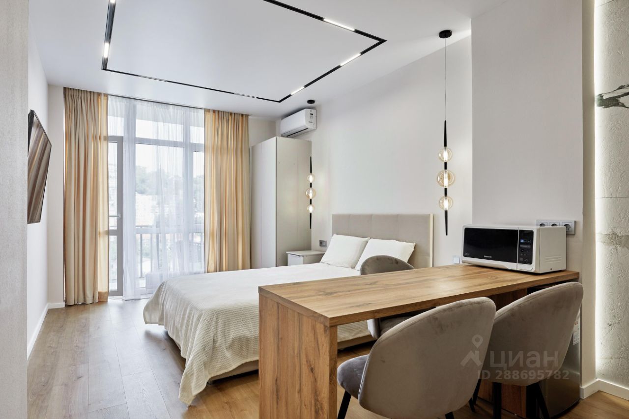 Собственник!!! Аренда до лета. Сдам в аренду студию, дизайнерский ремонт. Студия находится в центре Сочи, ул. Красная д.27 до набережной 15 минут пешком, до курортного 5-7 минут. В квартире есть вся бытовая техника ( посудомойка, стиралка, пылесос, индукционная плита, духовой шкаф электрический, инсталляция). Ремонт от талантливого дизайнера, продумано все, дорогое трекинговое освещение. Балкон с шикарным видом на горы, город и кусочек моря. На балконе есть кресло-качель. Вход в студию индивидуальный, с зоны парковки, территория огорожена. Все коммуникации центральные, своя газовая котельная на дом. Остановка автобуса прямо у дома. Много места для хранения вещей ( шкаф, гардеробная, антресоль, обувница, место под матрасом с подьемным механизмом)