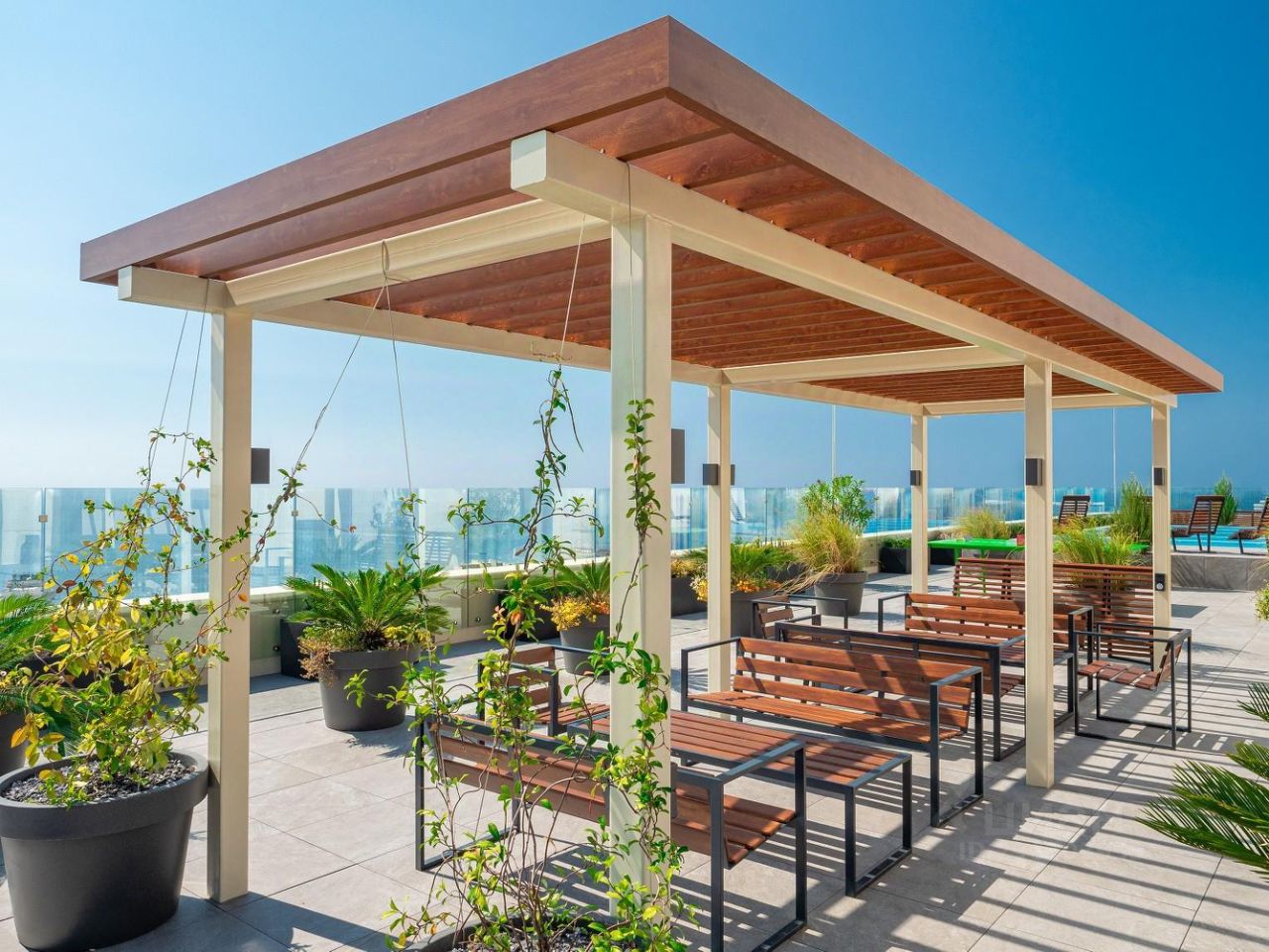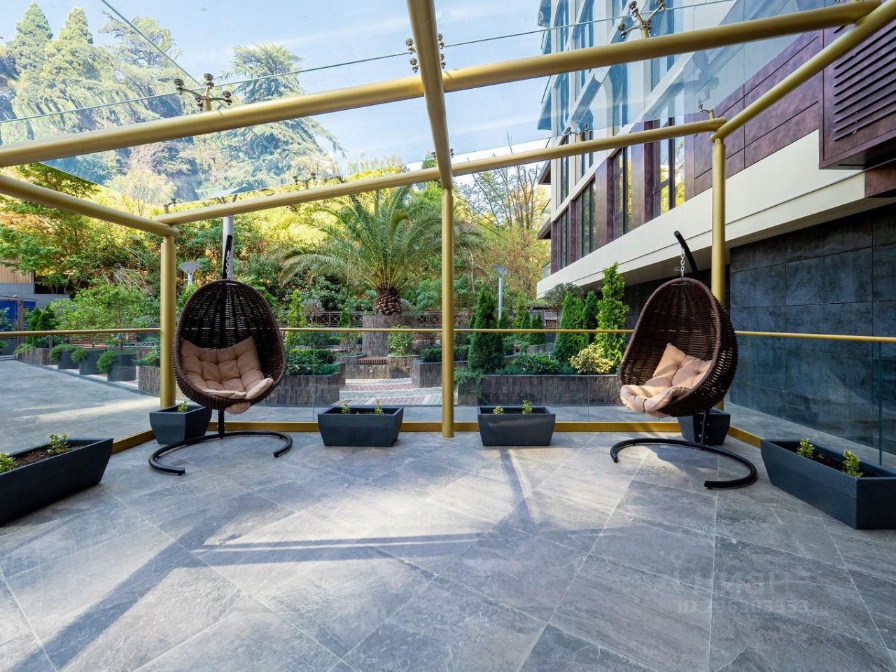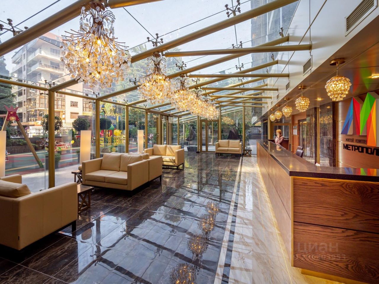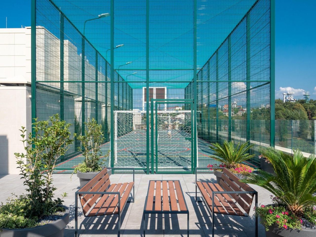 Изюминка дома это эксплуатируемая крыша с бассейном и видами на 360 градусов на весь Сочи, море и горы! На крыше так-же расположены лежаки для загара, спортивная площадка и тренажёры. На первом этаже нашего комплекса входная группа с зоной ресепшн, фонтан и детская площадка. Территория дома закрытая, без машин, что очень комфортно для отдыха с детьми.