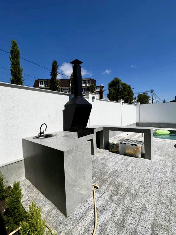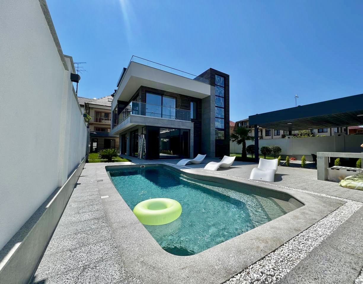 Дом с большой придомовой территорией, бассейном с противотоком для плавания, баня, лаундж зона, парковка для двух авто.