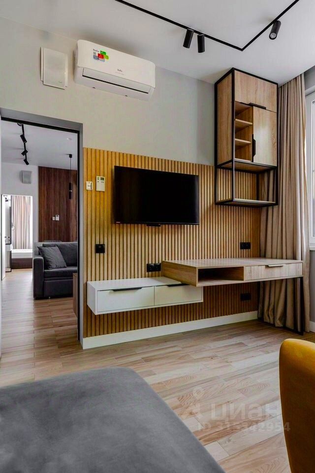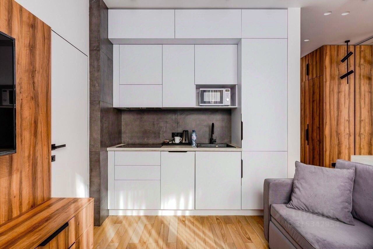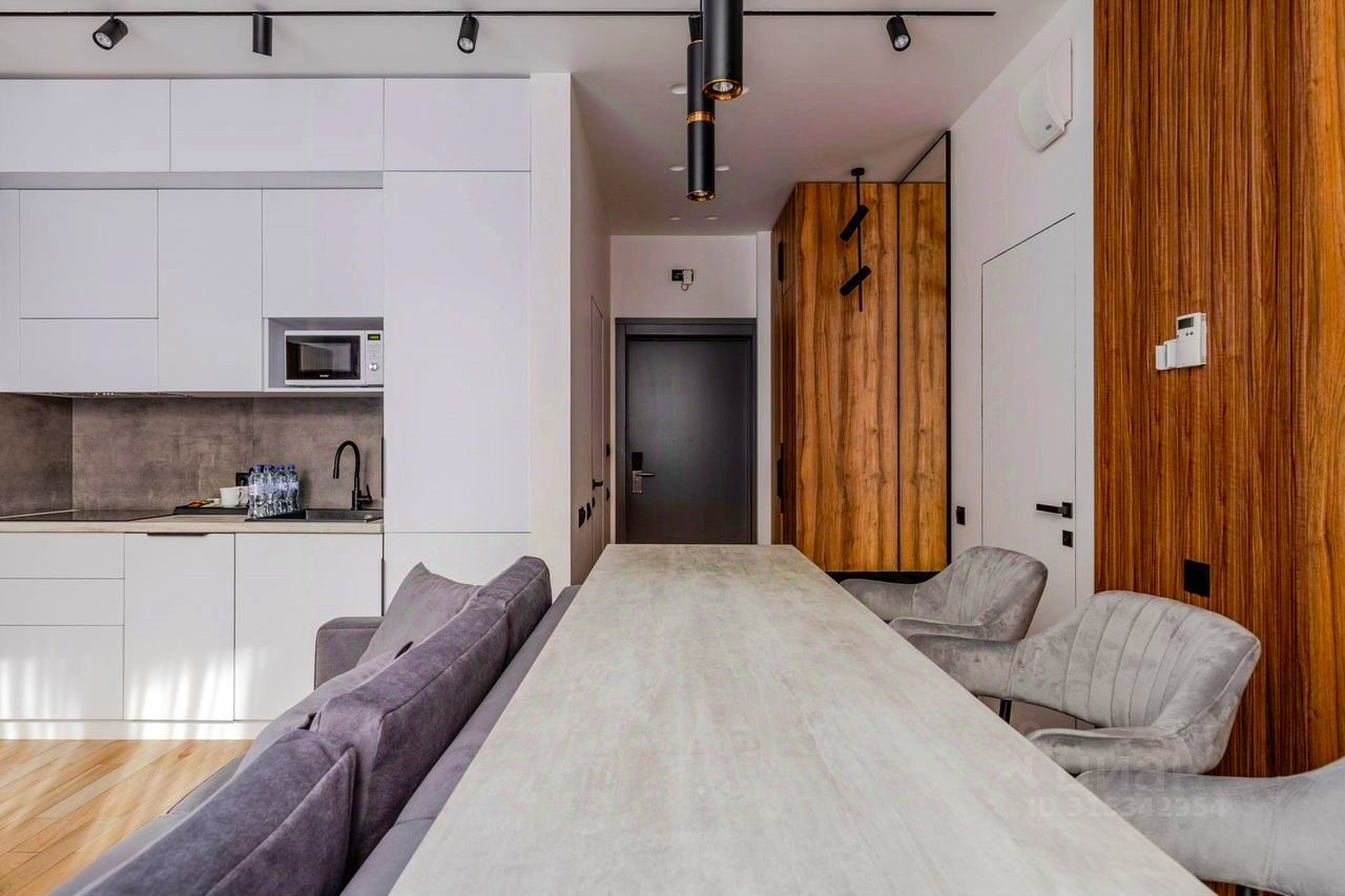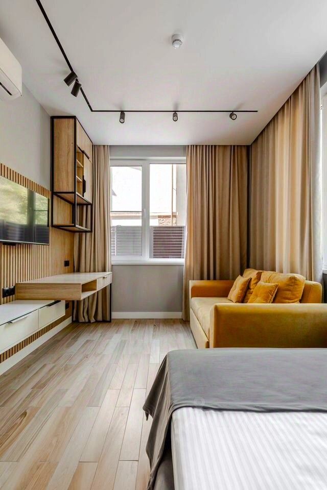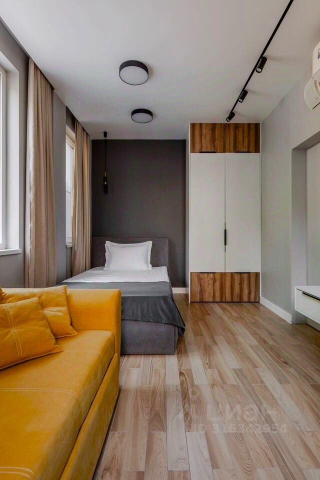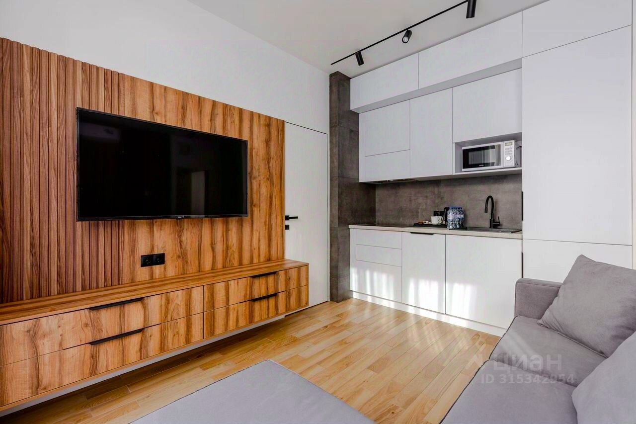 Апартамент выполнен в современном стиле с новым ремонтом и оснащен всей необходимой мебелью и техникой. Пространство разделено на просторную кухню-гостиную и уютную спальную комнату, что обеспечивает комфорт и функциональность.