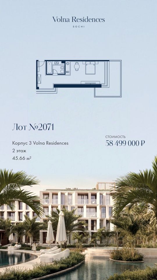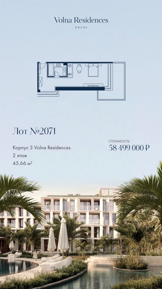 Продаются 1-комнатные апартаменты в строящемся доме (Дом 3), срок сдачи: II-кв. 2028, общей площадью 45.66 кв.м., на 2 этаже. Volna Residence - это комплекс для жизни на территории комплекса Volna, объединённый с отелем общей концепцией и инфраструктурой. 3 малоэтажных корпуса на 520 номеров расположены на первой береговой линии и имеют собственный бассейн.