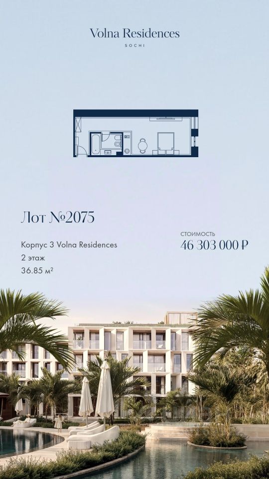 Продаются 1-комнатные апартаменты в строящемся доме (Дом 3), срок сдачи: II-кв. 2028, общей площадью 36.85 кв.м., на 2 этаже. Volna Residence - это комплекс для жизни на территории комплекса Volna, объединённый с отелем общей концепцией и инфраструктурой. 3 малоэтажных корпуса на 520 номеров расположены на первой береговой линии и имеют собственный бассейн.