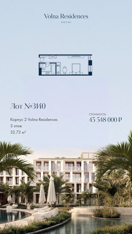 Продаются 1-комнатные апартаменты в строящемся доме (Дом 2), срок сдачи: II-кв. 2028, общей площадью 32.72 кв.м., на 3 этаже. Volna Residence - это комплекс для жизни на территории комплекса Volna, объединённый с отелем общей концепцией и инфраструктурой. 3 малоэтажных корпуса на 520 номеров расположены на первой береговой линии и имеют собственный бассейн.