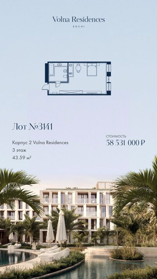 Продаётся 1-комнатная квартира в строящемся доме (Дом 2), срок сдачи: II-кв. 2028, общей площадью 43.59 кв.м., на 3 этаже. Volna Residence - это комплекс для жизни на территории комплекса Volna, объединённый с отелем общей концепцией и инфраструктурой. 3 малоэтажных корпуса на 520 номеров расположены на первой береговой линии и имеют собственный бассейн.