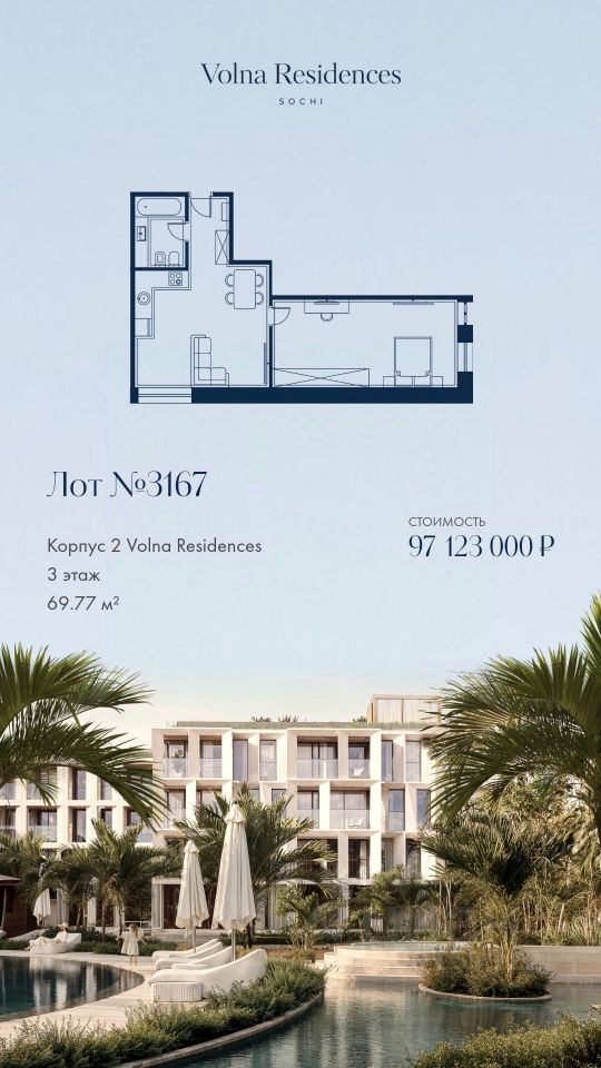 Продаются 1-комнатные апартаменты в строящемся доме (Дом 2), срок сдачи: II-кв. 2028, общей площадью 69.77 кв.м., на 3 этаже. Volna Residence - это комплекс для жизни на территории комплекса Volna, объединённый с отелем общей концепцией и инфраструктурой. 3 малоэтажных корпуса на 520 номеров расположены на первой береговой линии и имеют собственный бассейн.