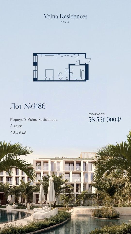 Продаётся 1-комнатная квартира в строящемся доме (Дом 2), срок сдачи: II-кв. 2028, общей площадью 43.59 кв.м., на 3 этаже. Volna Residence - это комплекс для жизни на территории комплекса Volna, объединённый с отелем общей концепцией и инфраструктурой. 3 малоэтажных корпуса на 520 номеров расположены на первой береговой линии и имеют собственный бассейн.