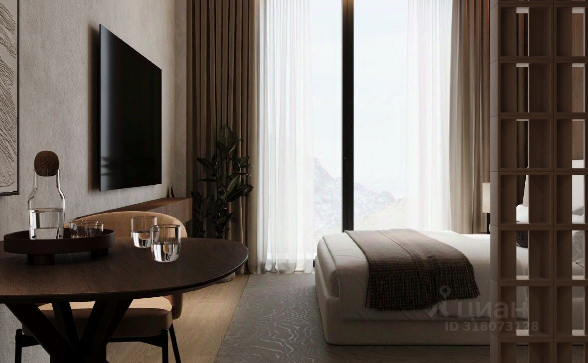В проекте представлены студии и апартаменты с 1 спальней. Высота потолков составляет 2,98 м, а из панорамных окон открываются виды на горы и окружающий пейзаж. Интерьеры оформлены в природных оттенках с использованием натуральных материалов: дерева и камня. В помещениях установлена встроенная мебель и техника премиальных брендов.