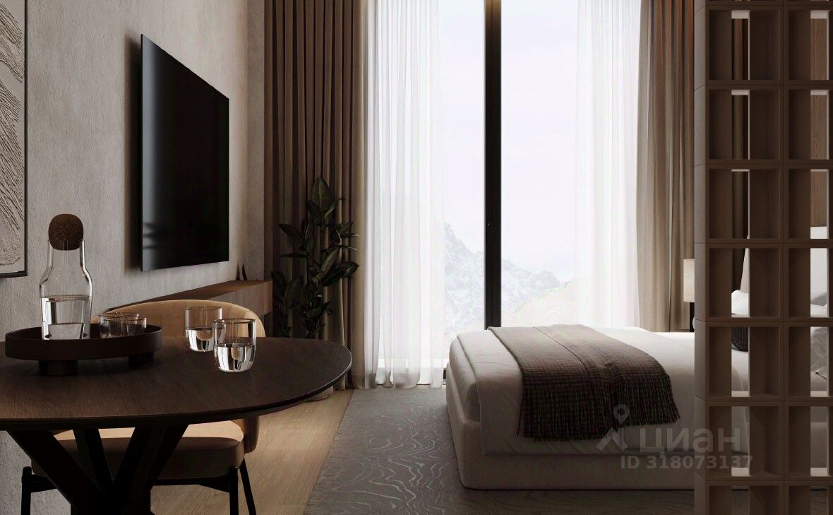 В проекте представлены студии и апартаменты с 1 спальней. Высота потолков составляет 2,98 м, а из панорамных окон открываются виды на горы и окружающий пейзаж. Интерьеры оформлены в природных оттенках с использованием натуральных материалов: дерева и камня. В помещениях установлена встроенная мебель и техника премиальных брендов.