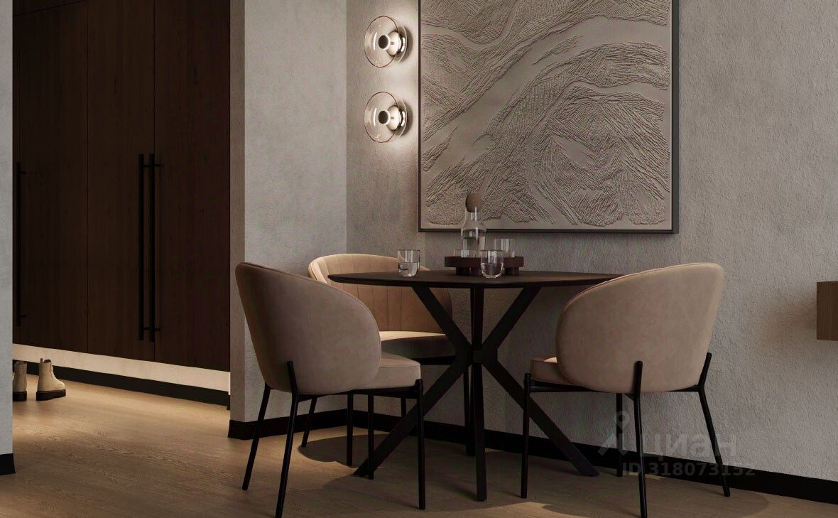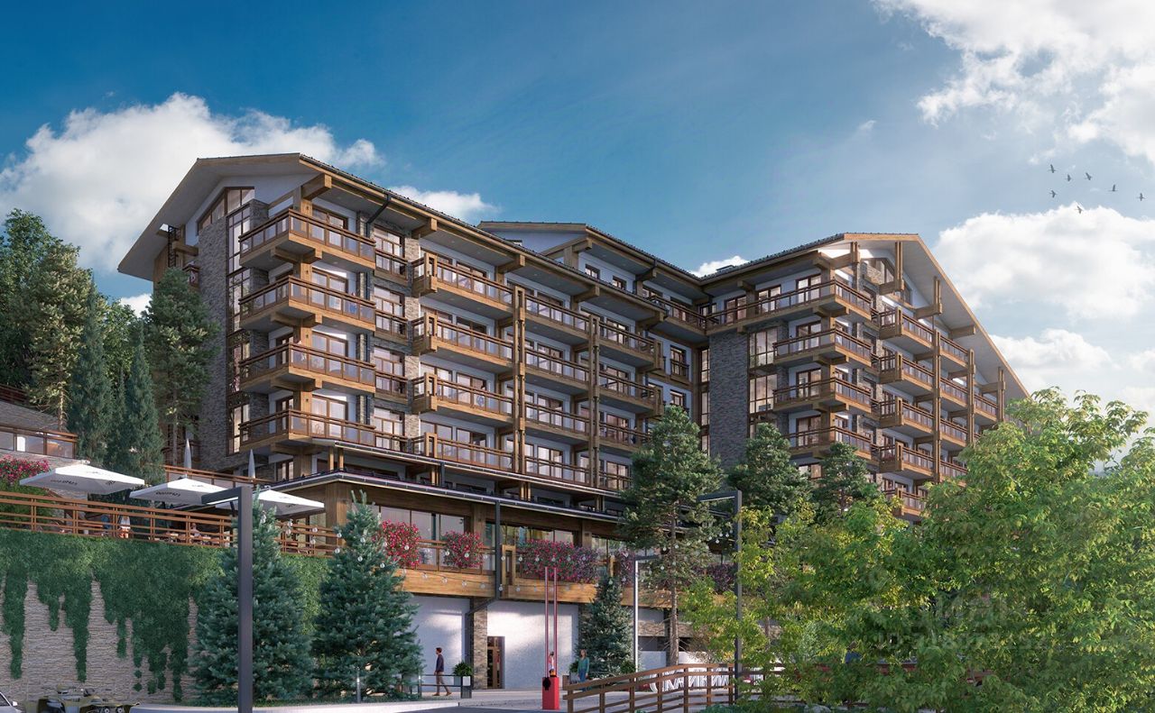 В проекте представлены студии и апартаменты с 1 спальней. Высота потолков составляет 2,98 м, а из панорамных окон открываются виды на горы и окружающий пейзаж. Интерьеры оформлены в природных оттенках с использованием натуральных материалов: дерева и камня. В помещениях установлена встроенная мебель и техника премиальных брендов.