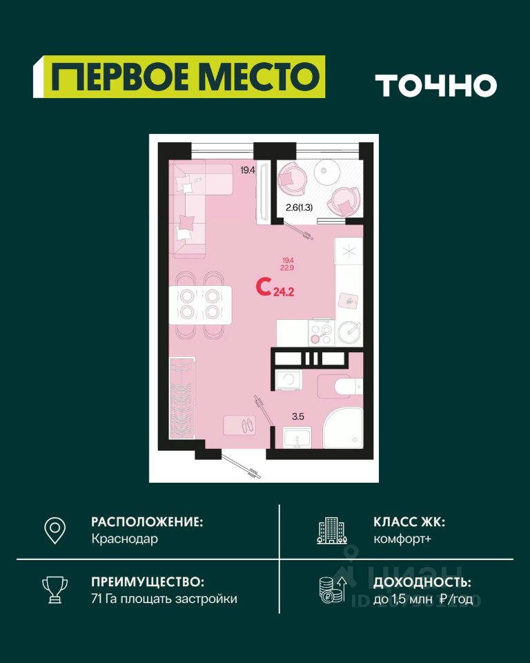 Жилой район ''Первое место''- один из самых масштабных проектов в России. На территории 71 га 18 кварталов, 31 дом переменной этажности от 8 до 18 этажей, собственный парк 9 га, храмовый комплекс, пешеходный бульвар ''Круг семьи'', детские и спортивные площадки, мангальные зоны и различные локации для отдыха. В шаговой доступности действующие муниципальные образовательные учреждения: школа на 1 100 мест и детский сад на 250 мест. Помимо этого, в жилом районе ''Первое место'' построятся школа на 1700 мест с крытым 25-метровым бассейном и 5 детских садов на 1 490 мест. На первых этажах многоуровневых парковок ''паркхабов'' разместится более 61 тыс м2 коммерческих помещений. Жителям будут доступны собственный фитнес-центр, кафе, рестораны и магазины. В каждом подъезде предусмотрены дизайнерские холлы в стиле лобби отелей, консьерж-сервис, лапомойки, отдельные колясочные и велосипедные. Также в домах будут просторные кладовые помещения и комнаты для хранения почты с почтоматами для получения посылок из маркетплейсов.