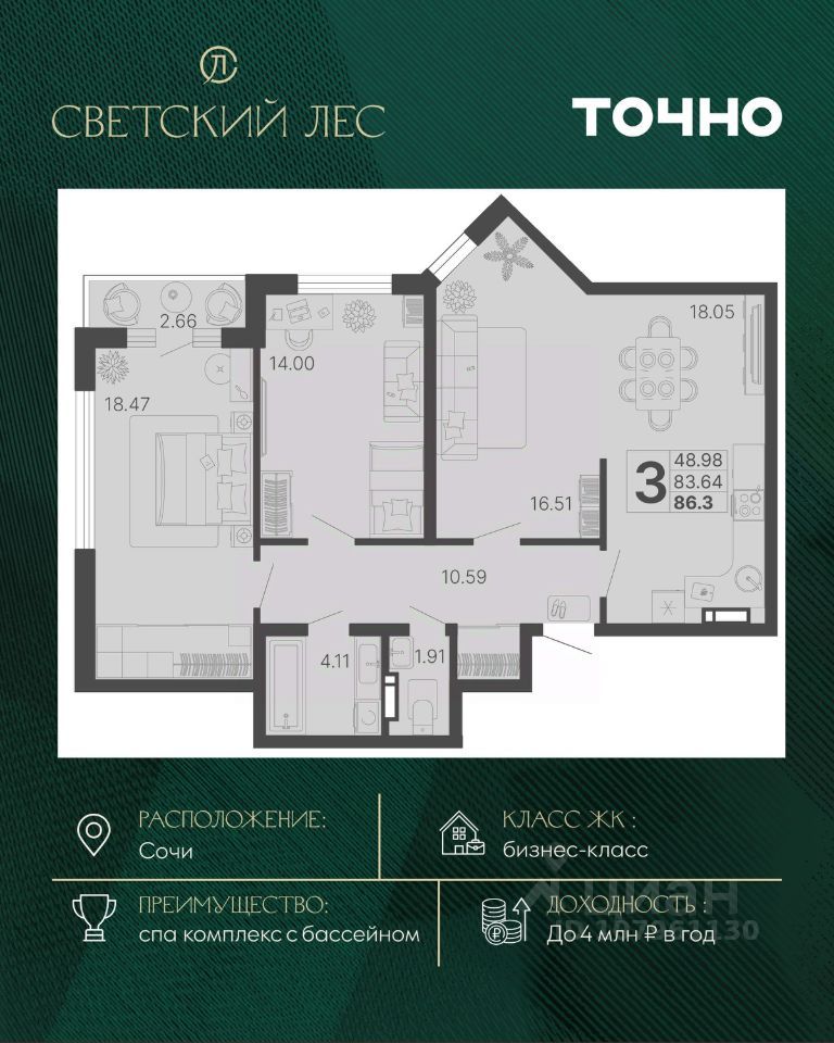 продам 3-к, Сочи36 961 950 ₽