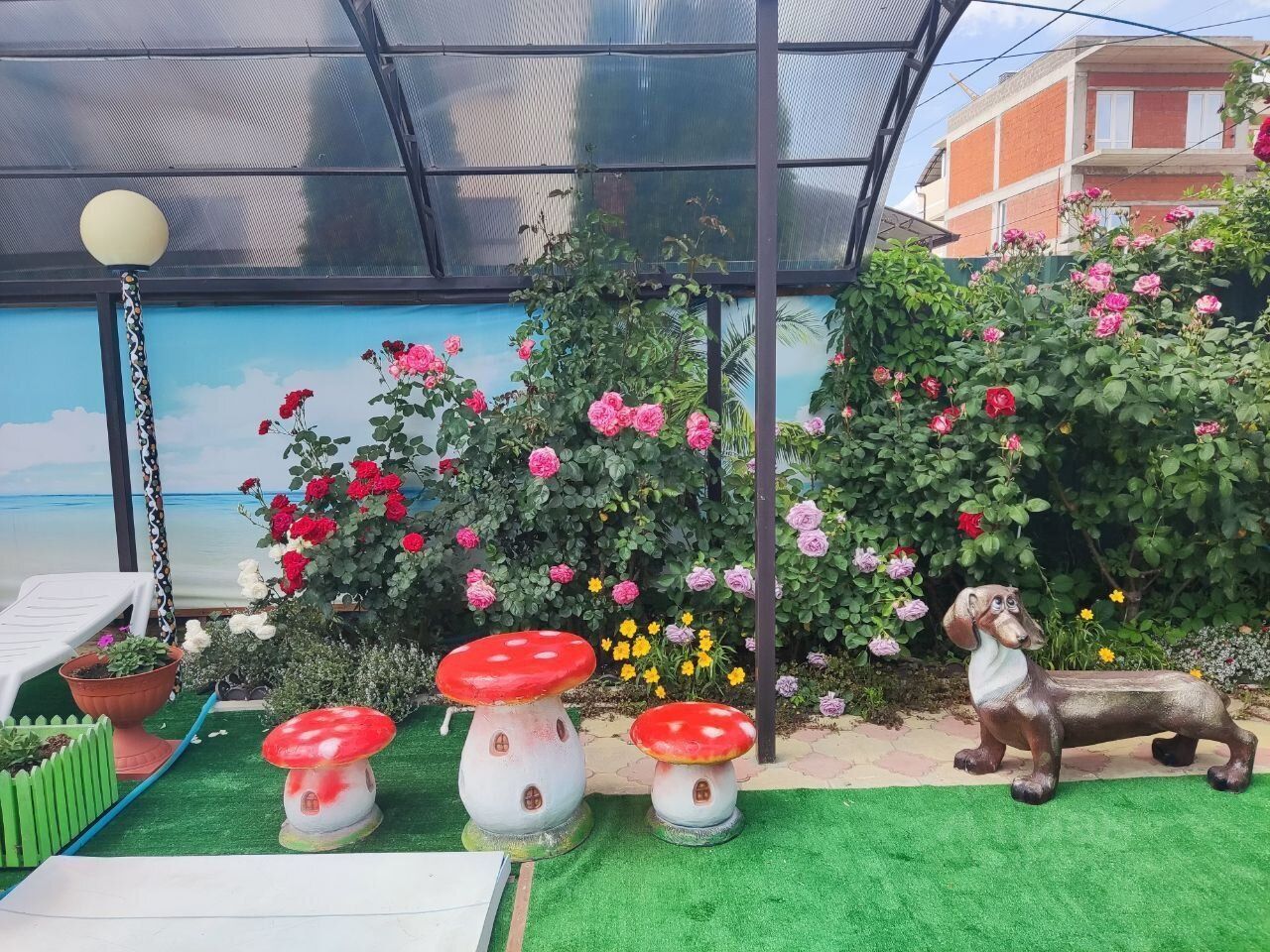 На территории гостевого дома созданы все условия для полноценного отдыха: бассейн с фильтром и подсветкой в ночное время, зона отдыха с лежаками, беседка, детская площадка, качели, декоративные элементы, много зелени, цветов, клумб.
