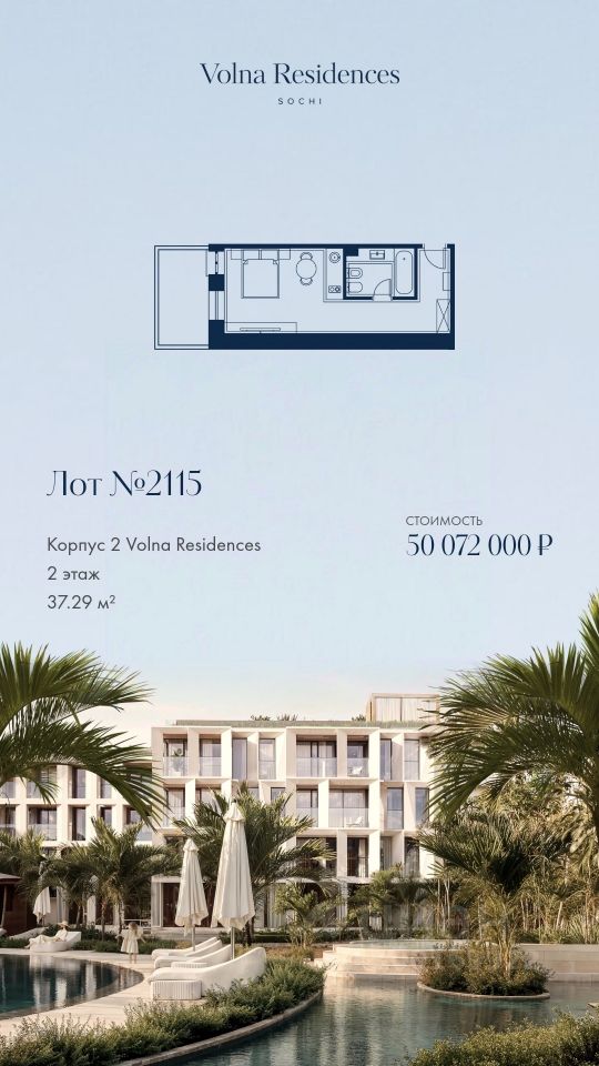 Продаётся 1-комнатная квартира в строящемся доме (Дом 2), срок сдачи: II-кв. 2028, общей площадью 37.29 кв.м., на 4 этаже. Volna Residence - это комплекс для жизни на территории комплекса Volna, объединённый с отелем общей концепцией и инфраструктурой. 3 малоэтажных корпуса на 520 номеров расположены на первой береговой линии и имеют собственный бассейн.