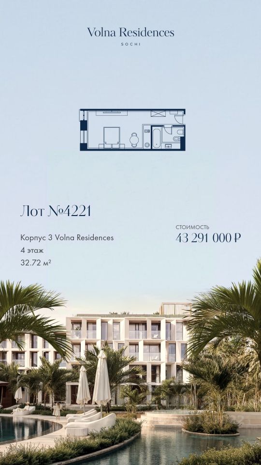Продаются 1-комнатные апартаменты в строящемся доме (Дом 3), срок сдачи: II-кв. 2028, общей площадью 32.72 кв.м., на 4 этаже. Volna Residence - это комплекс для жизни на территории комплекса Volna, объединённый с отелем общей концепцией и инфраструктурой. 3 малоэтажных корпуса на 520 номеров расположены на первой береговой линии и имеют собственный бассейн.
