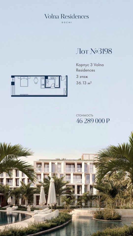 Продаётся 1-комнатная квартира в строящемся доме (Дом 3), срок сдачи: II-кв. 2028, общей площадью 36.13 кв.м., на 3 этаже. Volna Residence - это комплекс для жизни на территории комплекса Volna, объединённый с отелем общей концепцией и инфраструктурой. 3 малоэтажных корпуса на 520 номеров расположены на первой береговой линии и имеют собственный бассейн.