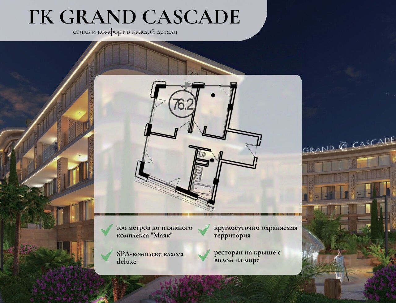 Grand Cascade состоит всего из 140 номеров, которые сдаются с премиальной отделкой ''под ключ'' и встроенной мебелью.