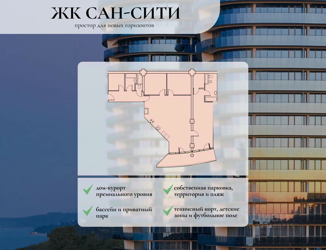 ''Сан-Сити'' — авторский проект, один из самых высоких домов Краснодарского края с эффектным двуобъемным фасадом и панорамными окнами, из которых открываются красивые виды на горы и море.