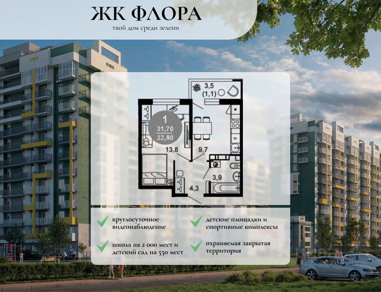 В состав комплекса входит школа на 2 000 мест, детский сад на 550 мест и фитнес-центр. На первых этажах расположены коммерческие помещения. Во дворах установлены детские площадки, спортивные комплексы и деревянные беседки для отдыха. По периметру ЖК ведется видеонаблюдение, к которому можно подключится online при помощи специального приложения для мобильных устройств. Рядом с комплексом располагается благоустроенная набережная реки Кудепста.