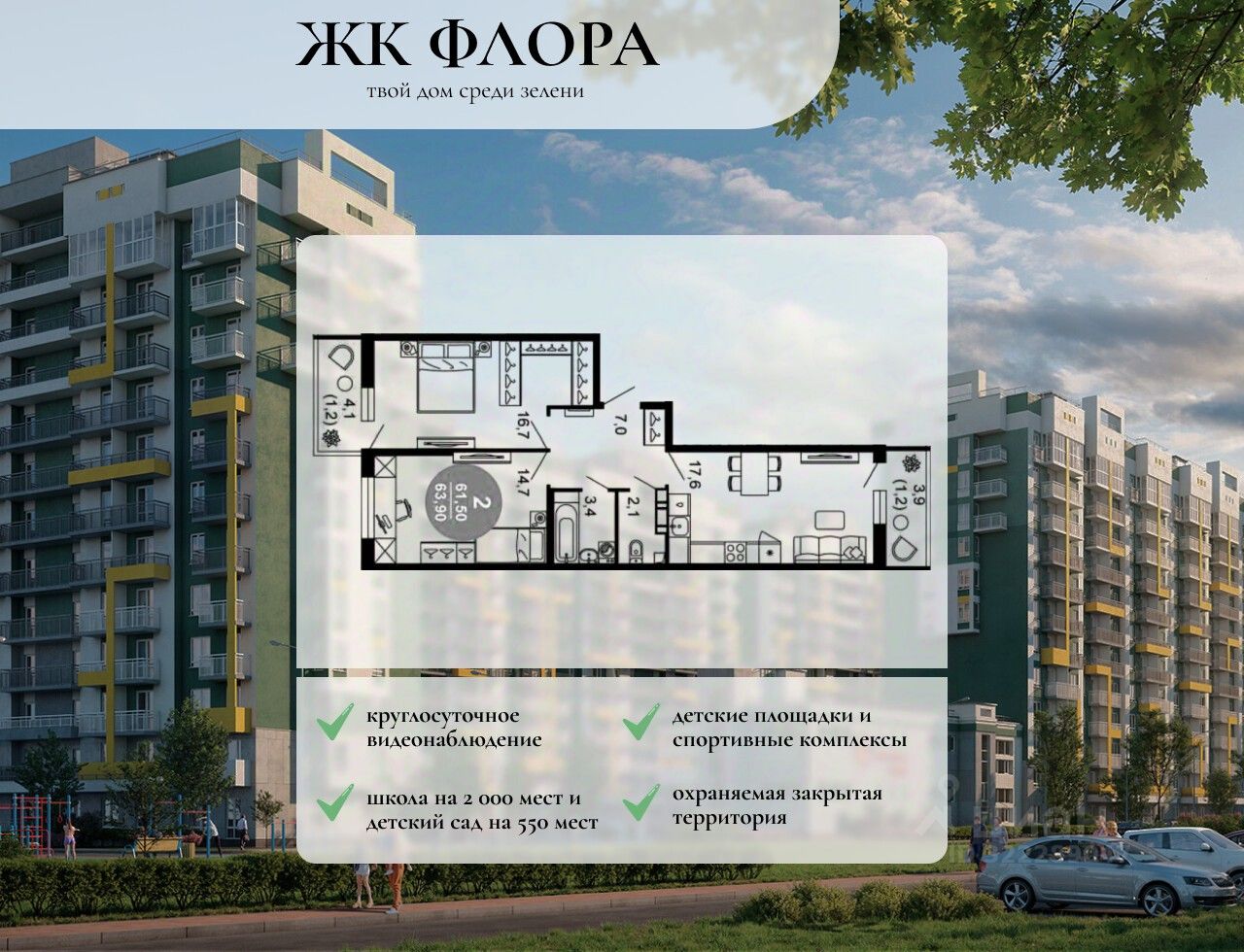 Покупателям в ЖК предложено множество планировочных решений: в наличии квартиры, как классического типа, так и европланировки. Из окон открываются виды на реку и горы. Квартиры сдаются без отделки.