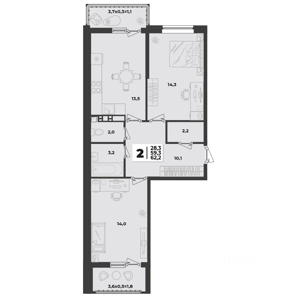 Общая площадь62,2 м2