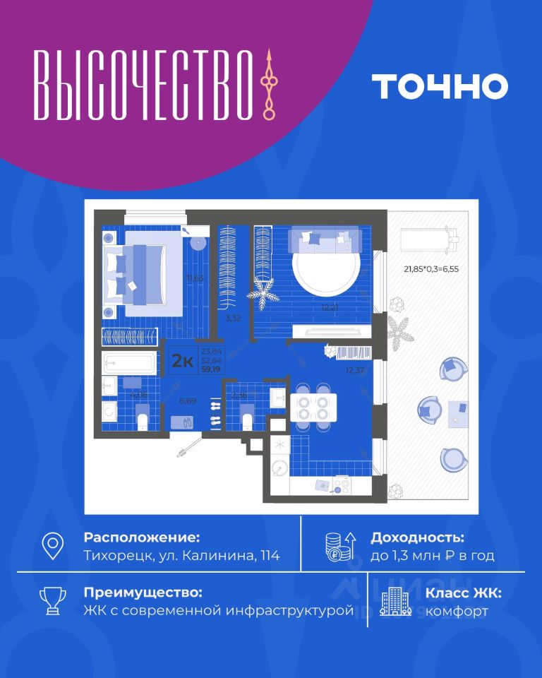 ''Высочество'' — первый ЖК комфорт-класса в Тихорецке. Современные технологии, новейшие представления о комфорте и эргономике жилья -это, то, что характеризует этот комплекс. Расположен в самом центре города. ''Высочество'' — это полностью самостоятельный жилой комплекс, жителей которого порадуют закрытый и свободный от машин двор, коммерческая галерея, спортивные и детские площадки с перголами для отдыха, уютная мангальная зона. По периметру жилого комплекса - открытый бесплатный паркинг на 370 м/мест. Недалеко от ЖК ''Высочество'' находятся детский сад, школы-гимназии, поликлиника, торговый центр, в пешей доступности расположен любимый сквер жителей города ''Звездный''.