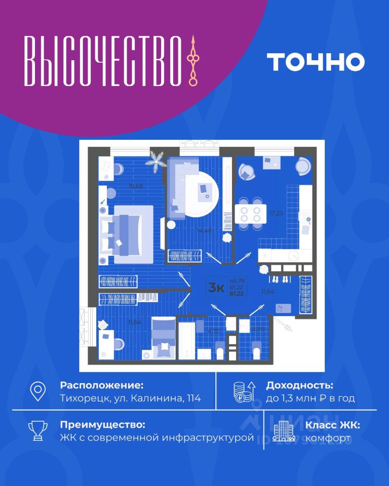 ''Высочество'' — первый ЖК комфорт-класса в Тихорецке. Современные технологии, новейшие представления о комфорте и эргономике жилья -это, то, что характеризует этот комплекс. Расположен в самом центре города. ''Высочество'' — это полностью самостоятельный жилой комплекс, жителей которого порадуют закрытый и свободный от машин двор, коммерческая галерея, спортивные и детские площадки с перголами для отдыха, уютная мангальная зона. По периметру жилого комплекса - открытый бесплатный паркинг на 370 м/мест. Недалеко от ЖК ''Высочество'' находятся детский сад, школы-гимназии, поликлиника, торговый центр, в пешей доступности расположен любимый сквер жителей города ''Звездный''.