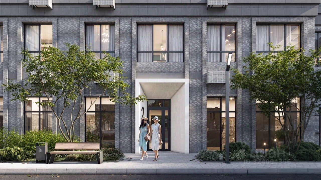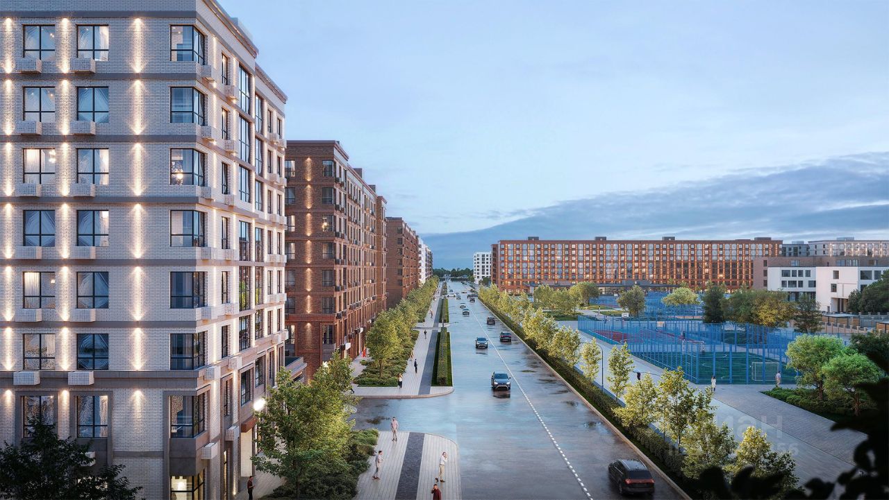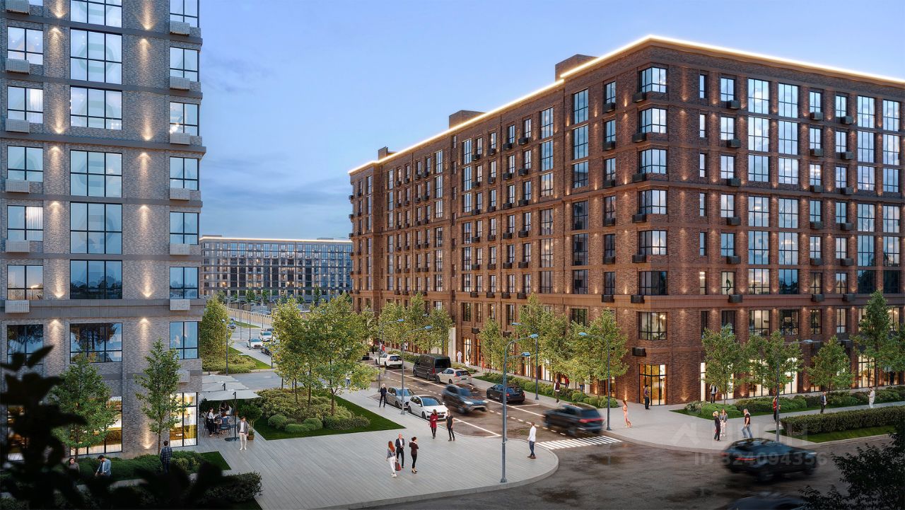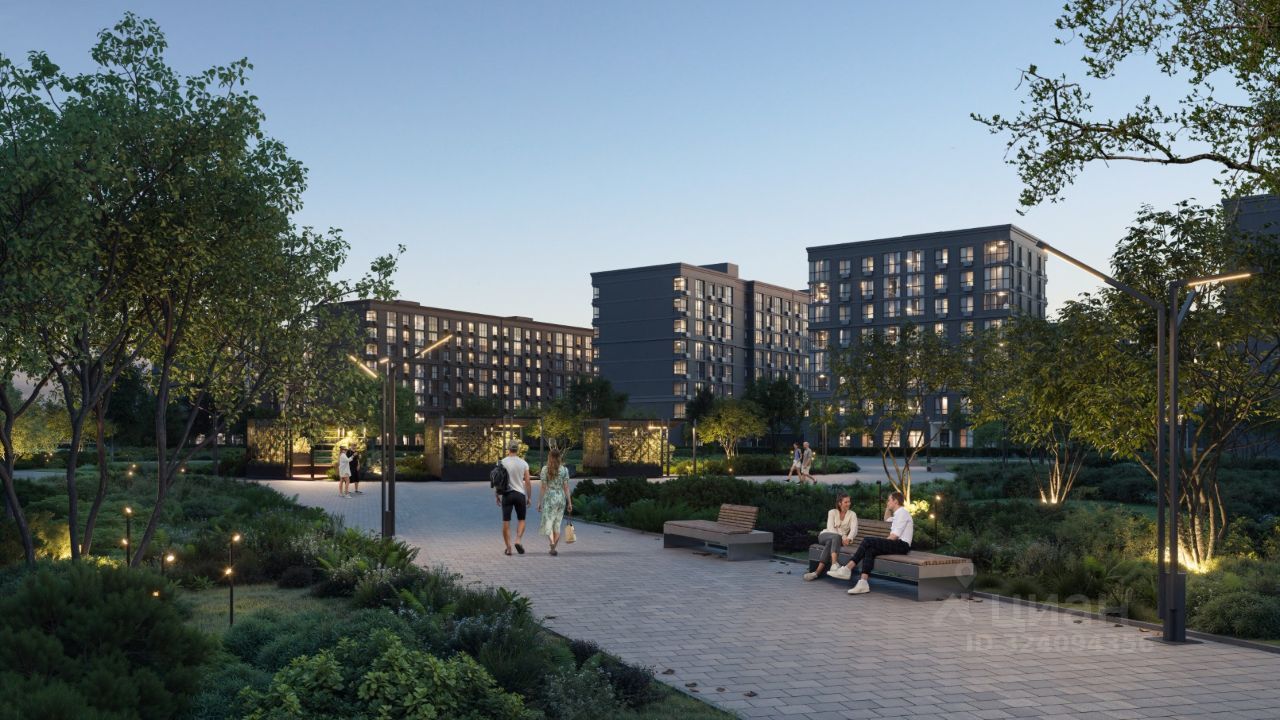 Архитектурные решения дополнены специальным освещением, которое подчеркивает фасады зданий и создает выразительный облик комплекса в вечернее время.