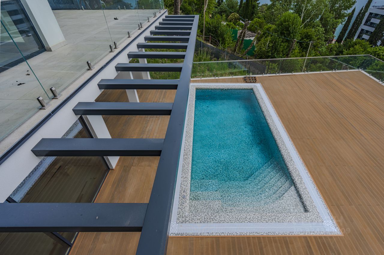 Характеристики объекта Состояние: без внутренней отделки — возможность реализовать индивидуальный дизайн-проект Конструкция: монолит, большие панорамные площади остекления Лифтовая шахта предусмотрена в доме Подземный гараж на 5 автомобилей Коммуникации: центральные — свет, вода, газ, канализация Участок: 8,3 сотки, выполнено профессиональное террасирование Бассейн: установлен круглогодичный подогреваемый бассейн