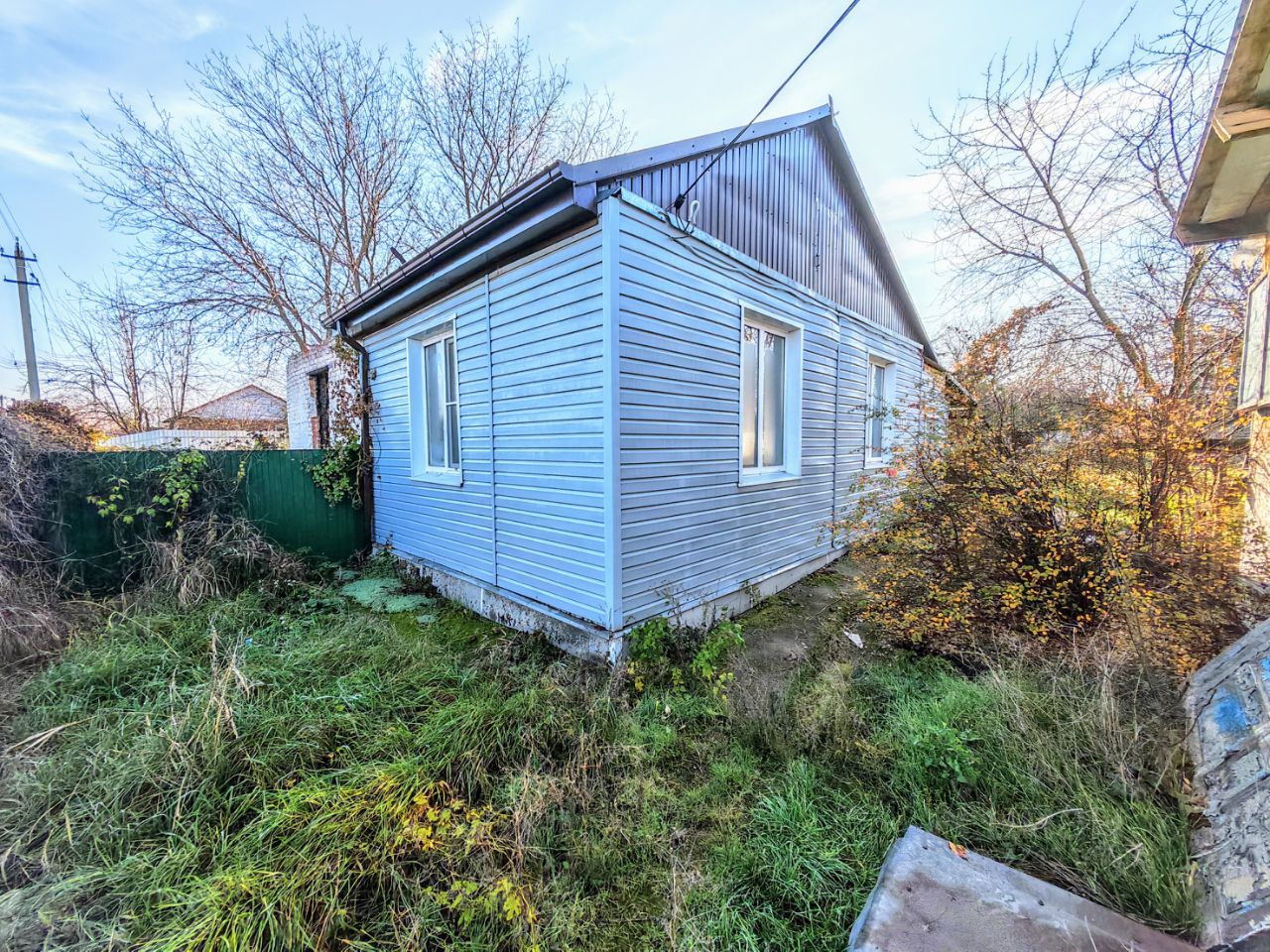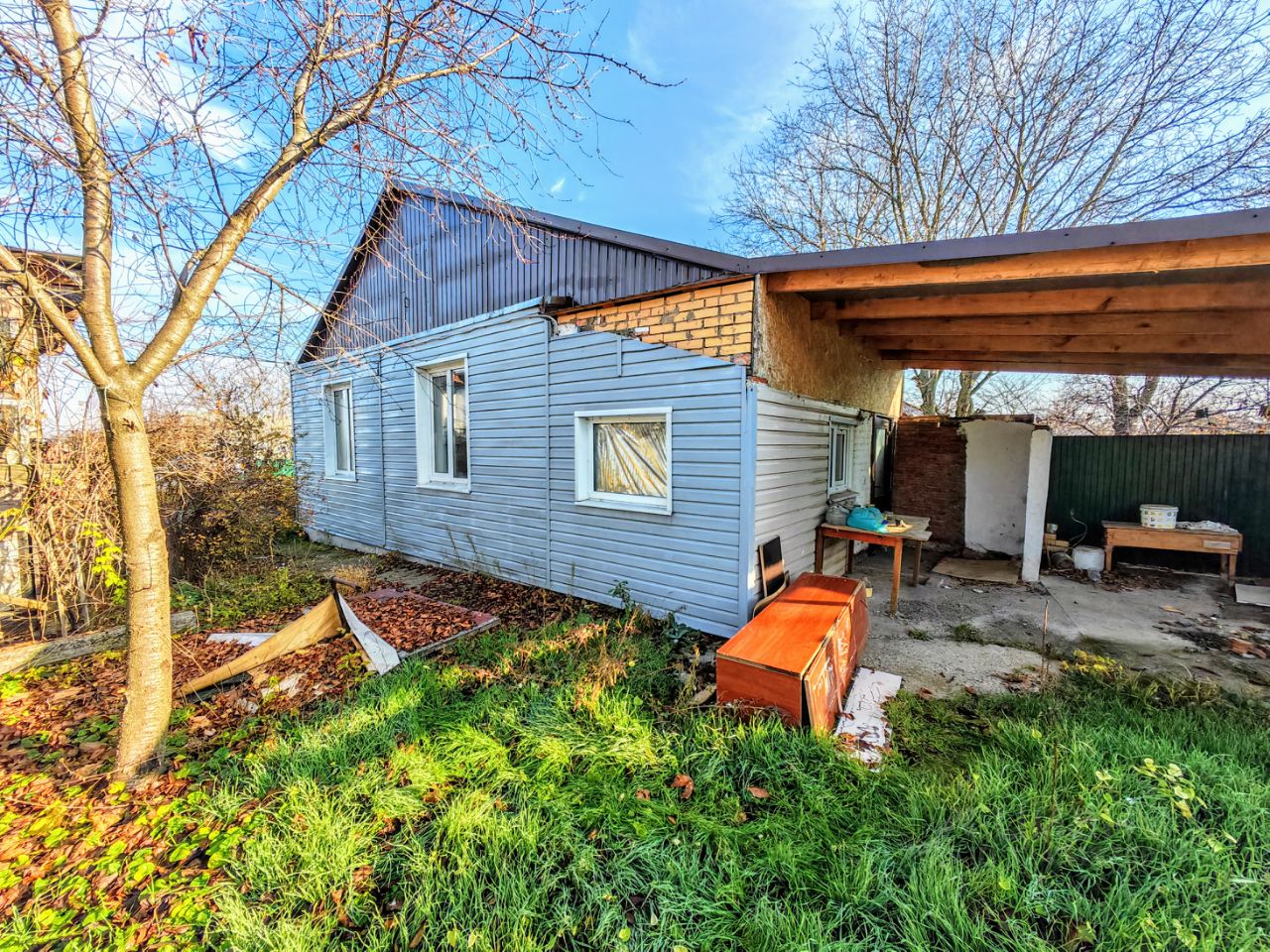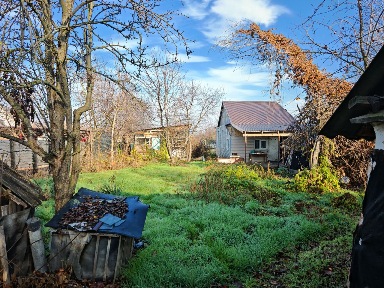Из хоз.построек: помещение, которое можно использовать, как гараж, или как мастерскую, сараи, уличная колонка. Канализация - септик. Земельный участок в пользовании с плодовыми деревьями. Железный забор, ширина фасада 15,46 м.. Перед двором есть место для стоянки автомобиля.