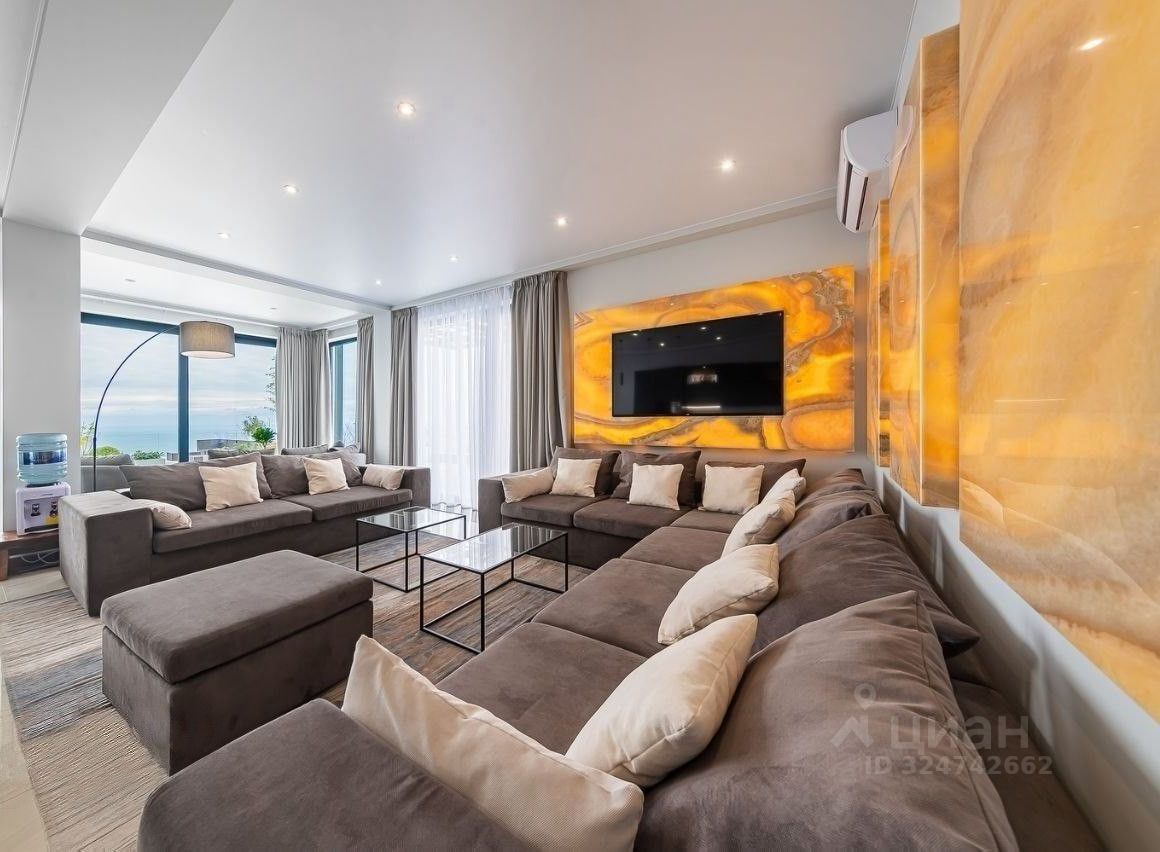 — Широкая гостиная с комфортной зоной отдыха, большим телевизором и потрясающими видами на море сквозь панорамные оконные конструкции.